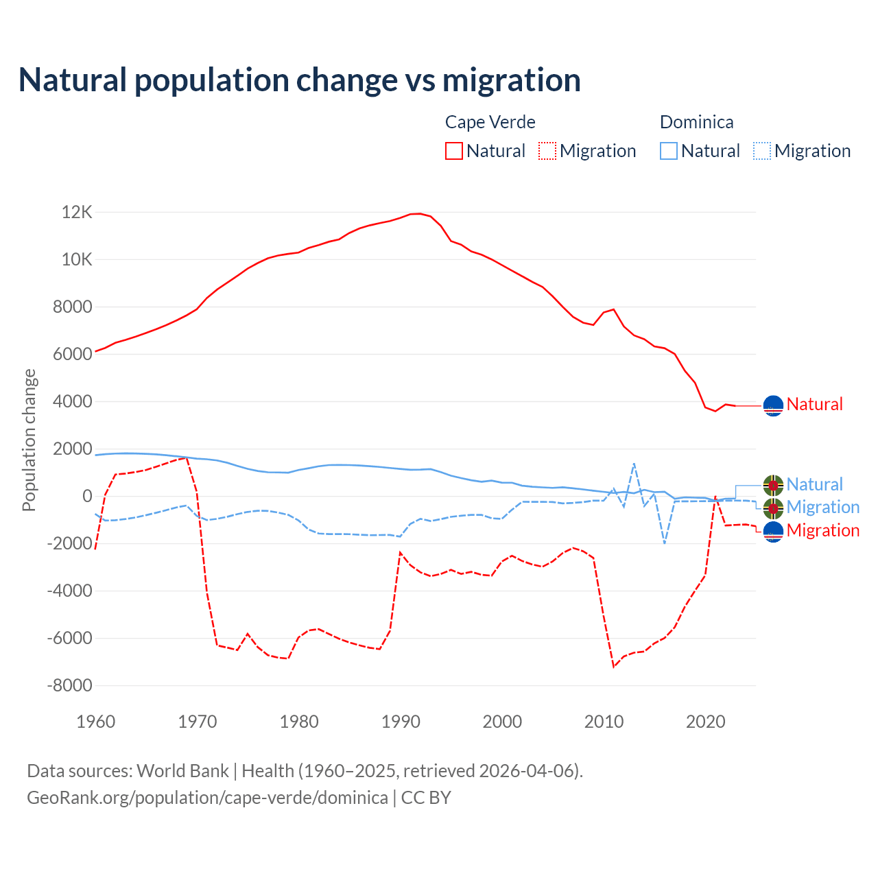 Over the last 10 years, 56.4% of the population change in Cape Verde is from natural causes (a gain of 50,193 people) and 43.6% is from migration (a loss of 38,879 people). In Dominica 4.63% is from natural causes (a loss of 190 people) and 95.4% is from migration (a loss of 3,914 people).