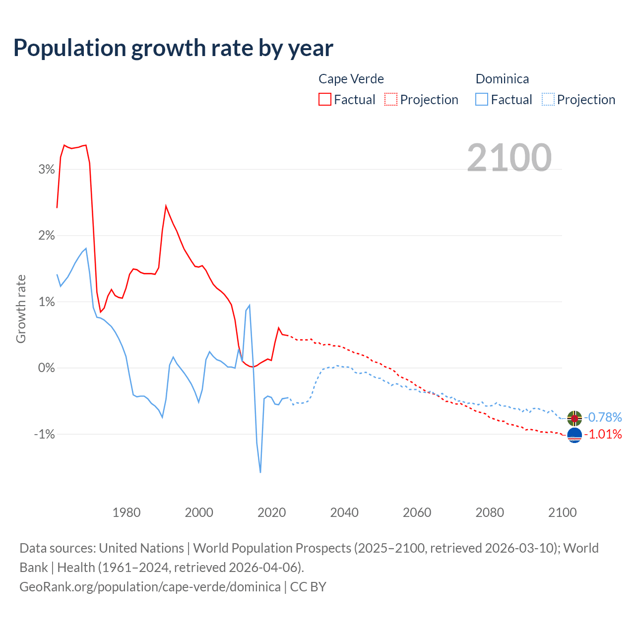 - For the last 10 years, Cape Verde has had an average growth rate of +0.22% per year vs -0.47% in Dominica.