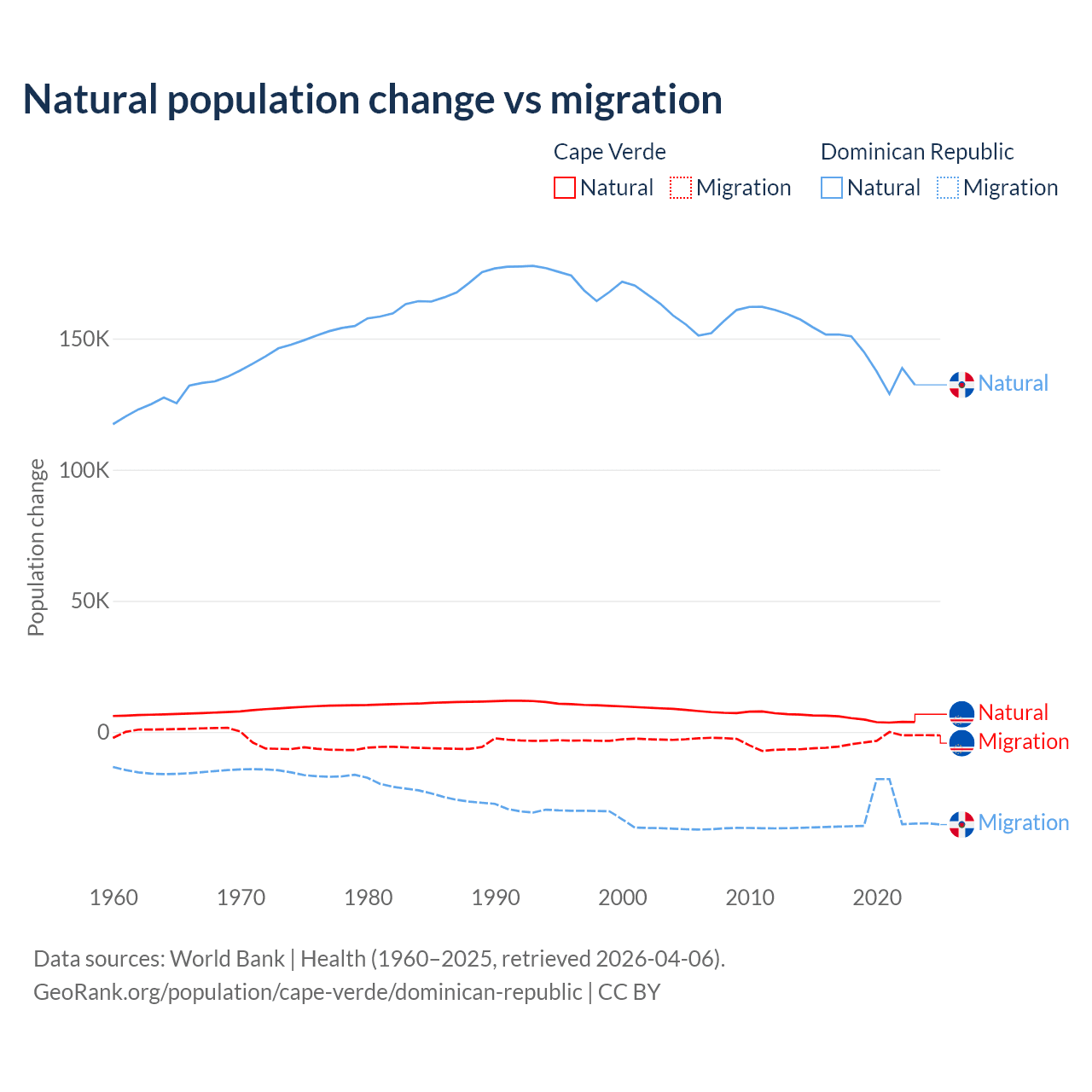 Over the last 10 years, 56.4% of the population change in Cape Verde is from natural causes (a gain of 50,193 people) and 43.6% is from migration (a loss of 38,879 people). In the Dominican Republic 81.8% is from natural causes (a gain of 1,447,764 people) and 18.2% is from migration (a loss of 322,919 people).