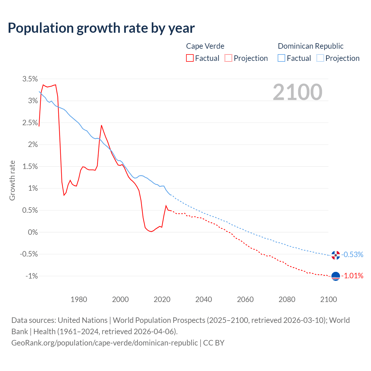 - For the last 10 years, Cape Verde has had an average growth rate of +0.22% per year vs +1.04% in the Dominican Republic.