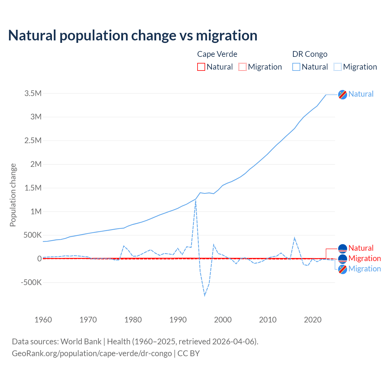 Over the last 10 years, 56.4% of the population change in Cape Verde is from natural causes (a gain of 50,193 people) and 43.6% is from migration (a loss of 38,879 people). In the DR Congo 99.1% is from natural causes (a gain of 30,150,516 people) and 0.89% is from migration (a gain of 270,872 people).