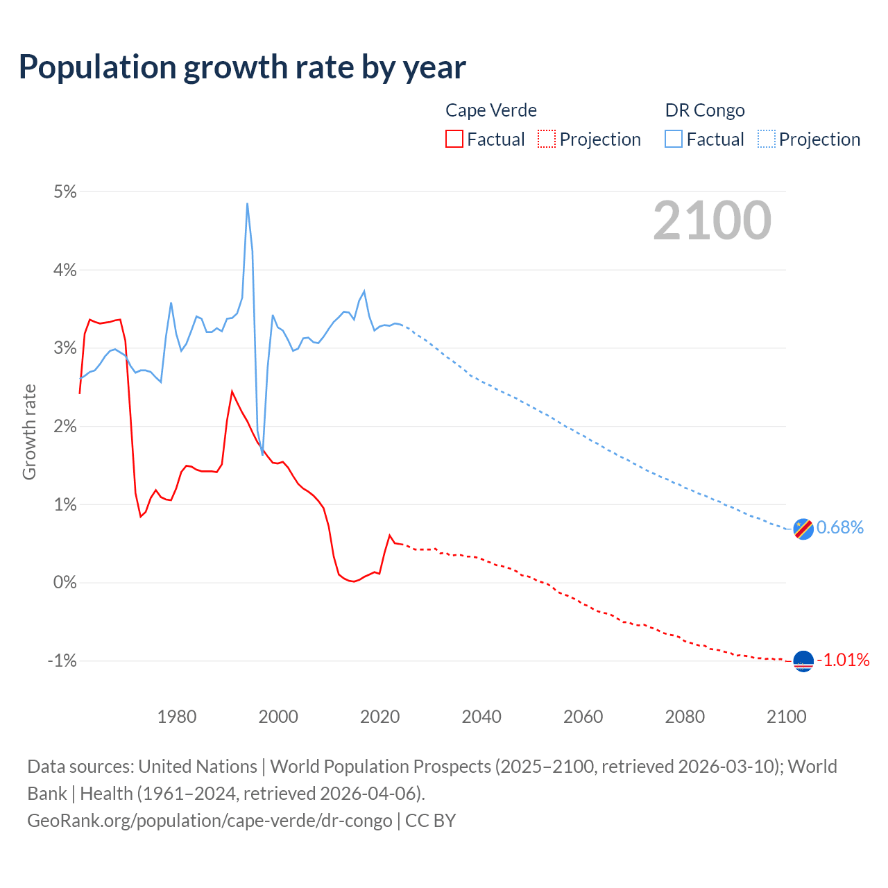 - For the last 10 years, Cape Verde has had an average growth rate of +0.22% per year vs +3.38% in the DR Congo.