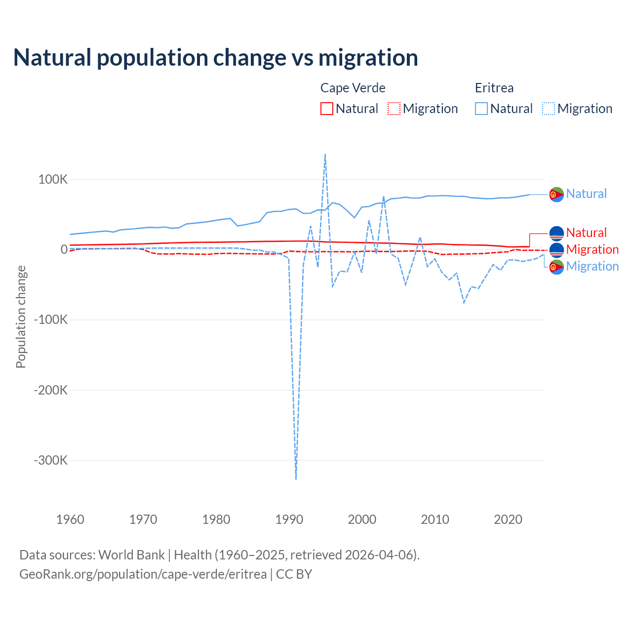 Over the last 10 years, 56.4% of the population change in Cape Verde is from natural causes (a gain of 50,193 people) and 43.6% is from migration (a loss of 38,879 people). In Eritrea 68.8% is from natural causes (a gain of 742,837 people) and 31.2% is from migration (a loss of 336,243 people).
