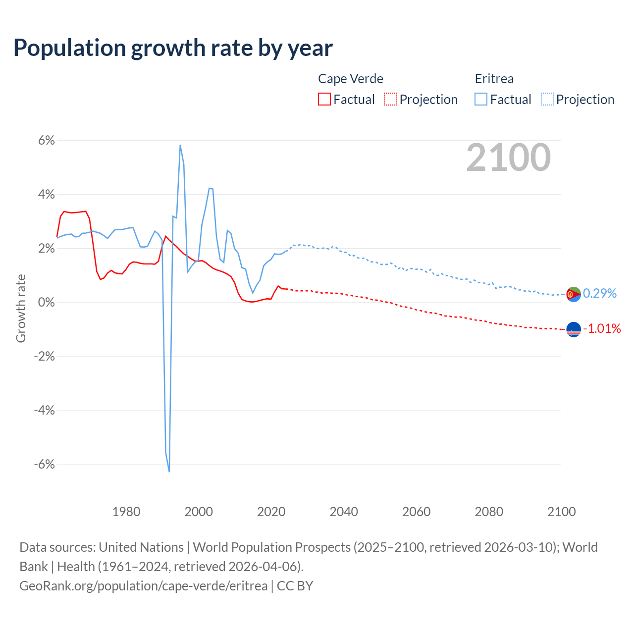- For the last 10 years, Cape Verde has had an average growth rate of +0.22% per year vs +1.28% in Eritrea.