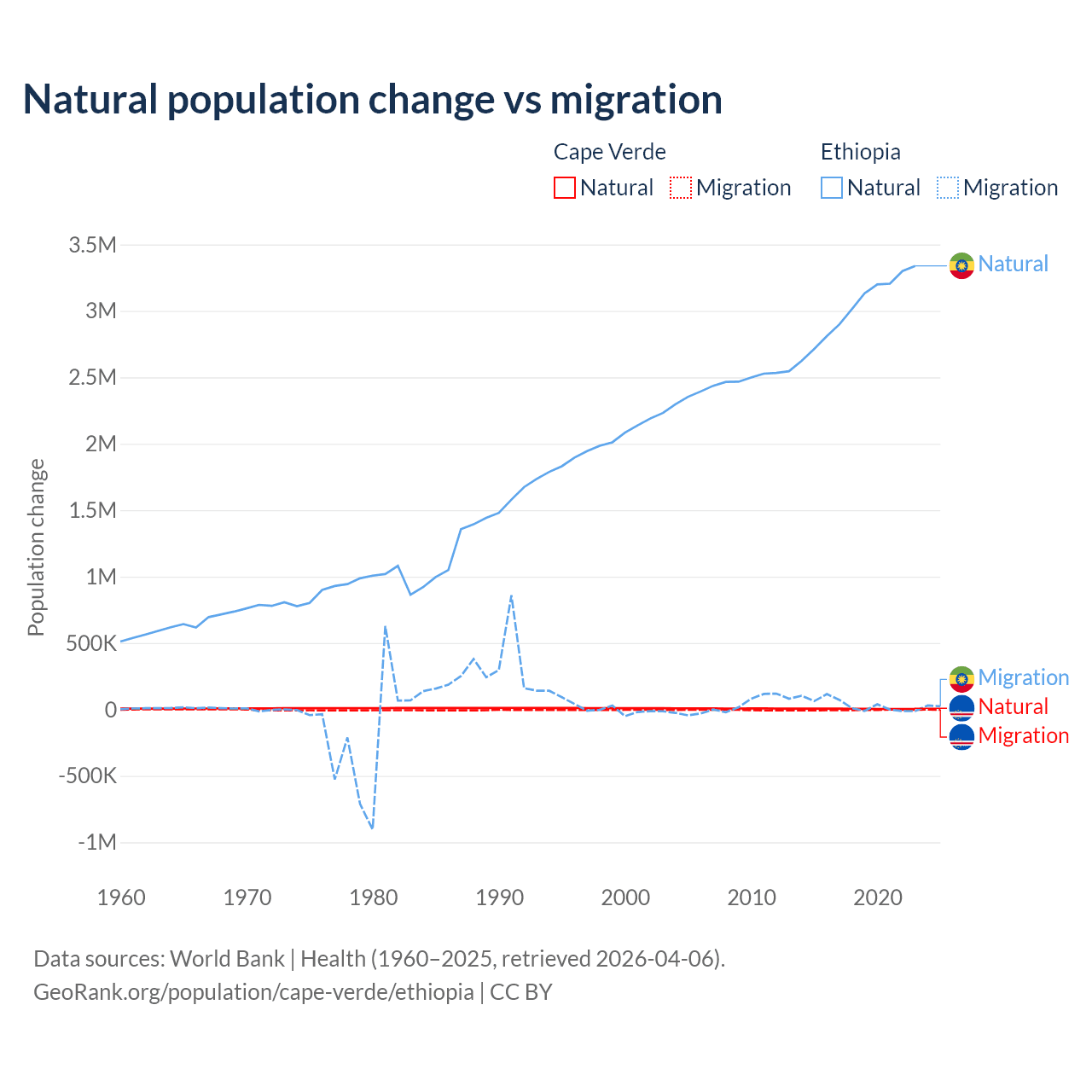 Over the last 10 years, 56.4% of the population change in Cape Verde is from natural causes (a gain of 50,193 people) and 43.6% is from migration (a loss of 38,879 people). In Ethiopia 98.8% is from natural causes (a gain of 30,237,373 people) and 1.19% is from migration (a gain of 365,488 people).