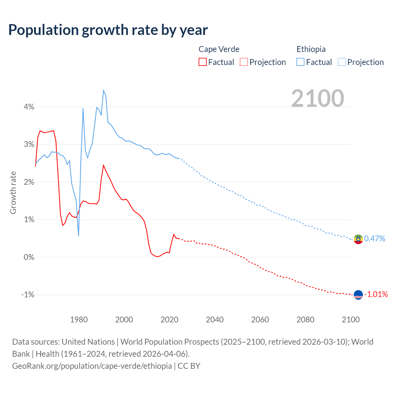 - For the last 10 years, Cape Verde has had an average growth rate of +0.22% per year vs +2.71% in Ethiopia.