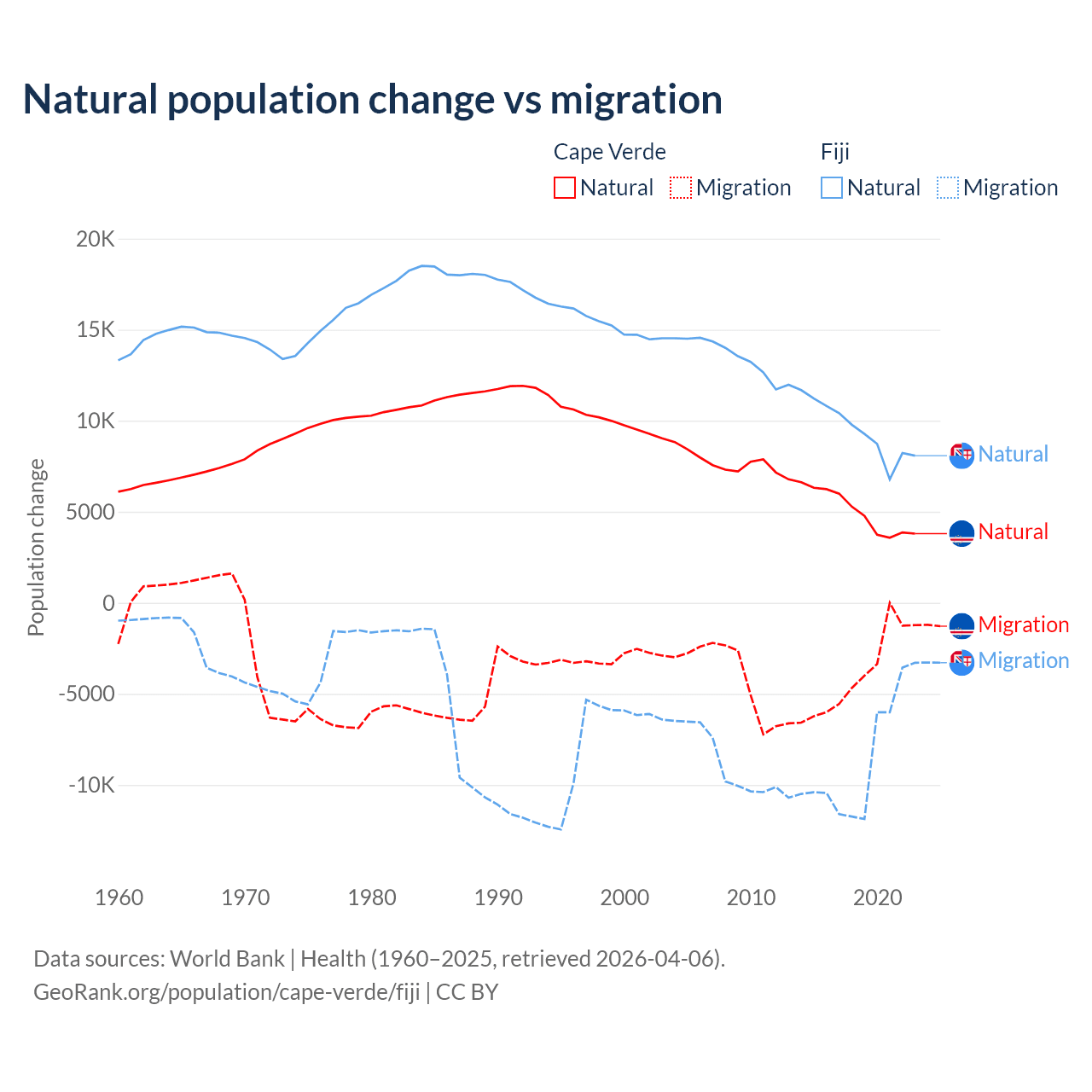 Over the last 10 years, 56.4% of the population change in Cape Verde is from natural causes (a gain of 50,193 people) and 43.6% is from migration (a loss of 38,879 people). In Fiji 52.6% is from natural causes (a gain of 94,971 people) and 47.4% is from migration (a loss of 85,415 people).