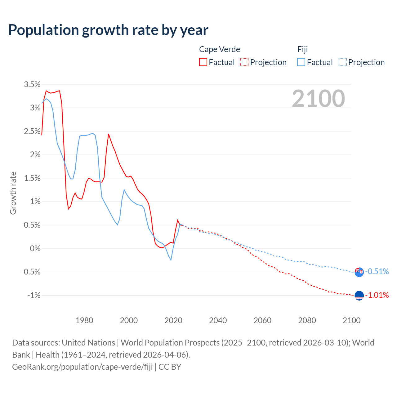 - For the last 10 years, Cape Verde has had an average growth rate of +0.22% per year vs +0.12% in Fiji.