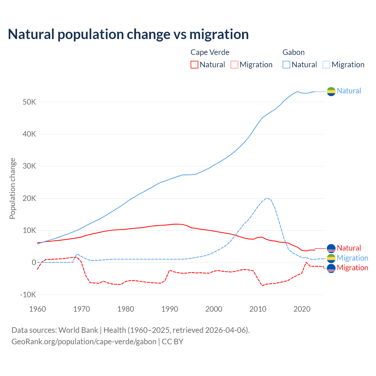 Over the last 10 years, 56.4% of the population change in Cape Verde is from natural causes (a gain of 50,193 people) and 43.6% is from migration (a loss of 38,879 people). In Gabon 91.1% is from natural causes (a gain of 515,484 people) and 8.86% is from migration (a gain of 50,119 people).