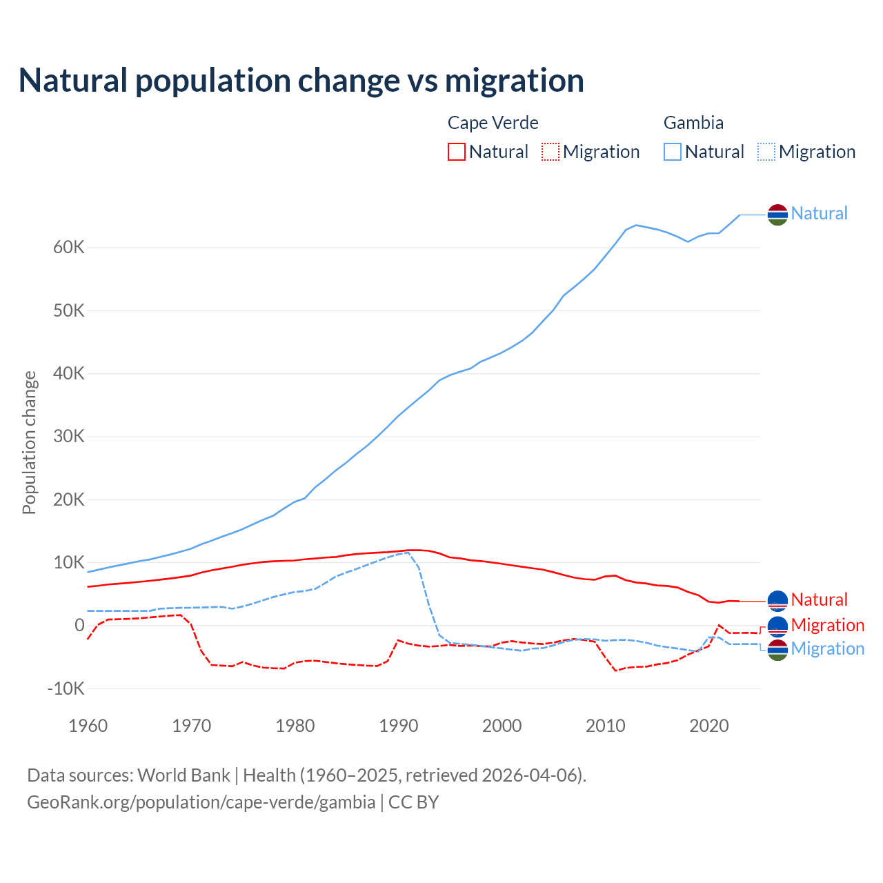 Over the last 10 years, 56.4% of the population change in Cape Verde is from natural causes (a gain of 50,193 people) and 43.6% is from migration (a loss of 38,879 people). In the Gambia 95.2% is from natural causes (a gain of 625,795 people) and 4.75% is from migration (a loss of 31,227 people).