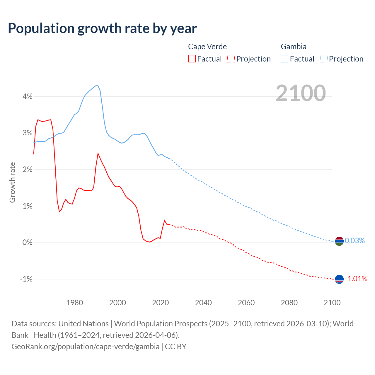- For the last 10 years, Cape Verde has had an average growth rate of +0.22% per year vs +2.5% in the Gambia.
