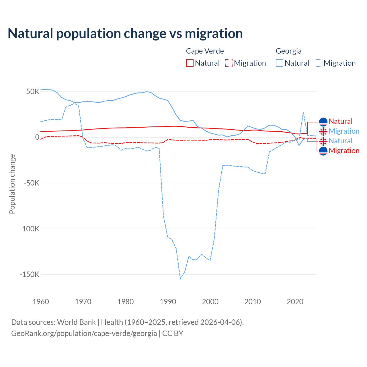 Over the last 10 years, 56.4% of the population change in Cape Verde is from natural causes (a gain of 50,193 people) and 43.6% is from migration (a loss of 38,879 people). In Georgia 57.7% is from natural causes (a gain of 47,646 people) and 42.3% is from migration (a loss of 34,907 people).