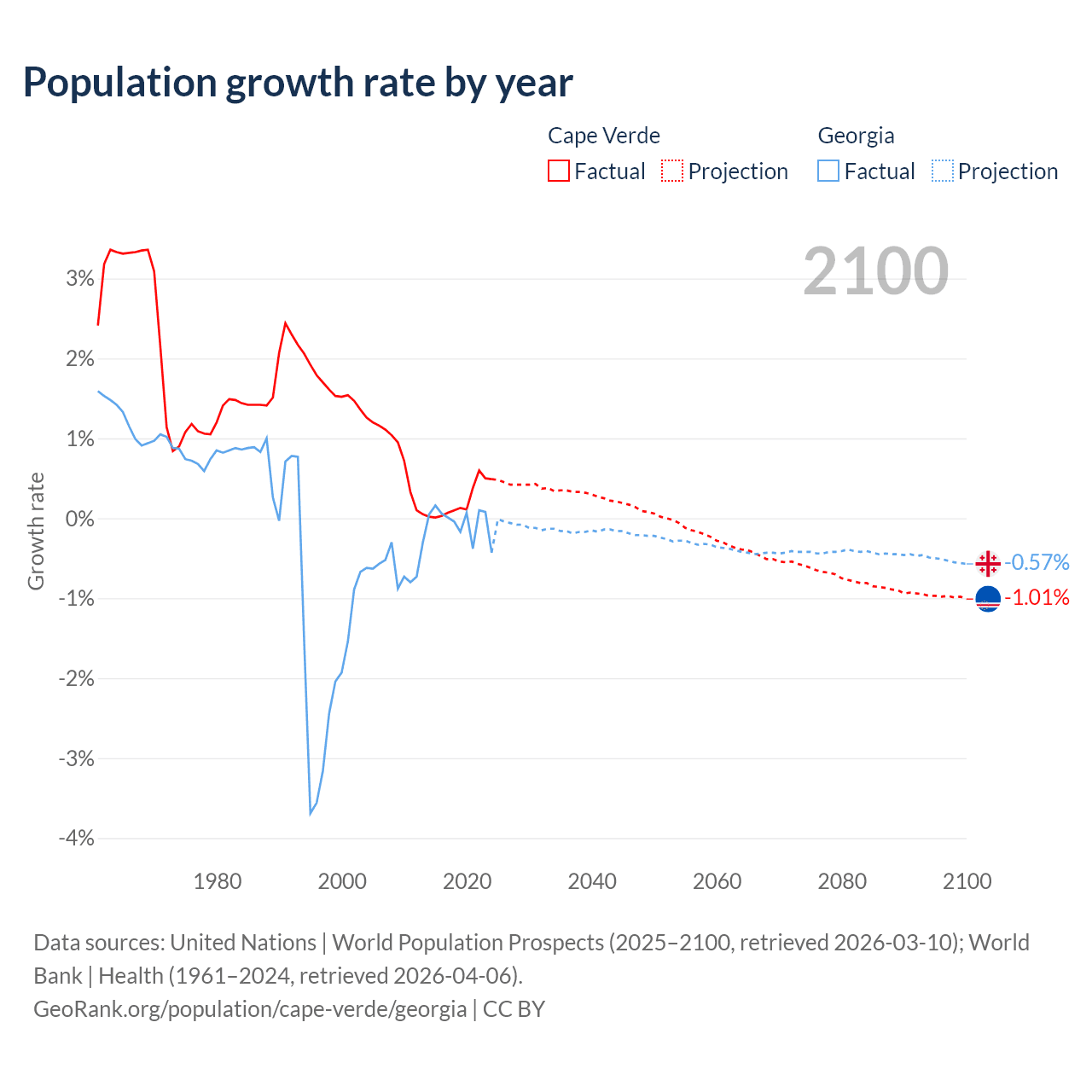 - For the last 10 years, Cape Verde has had an average growth rate of +0.22% per year vs -0.04% in Georgia.