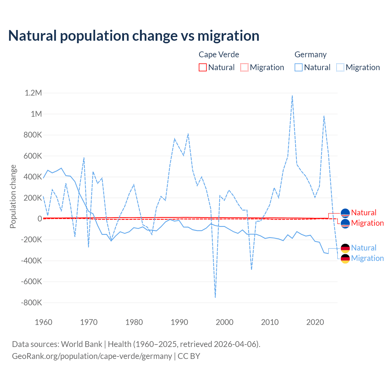 Over the last 10 years, 56.4% of the population change in Cape Verde is from natural causes (a gain of 50,193 people) and 43.6% is from migration (a loss of 38,879 people). In Germany 26.8% is from natural causes (a loss of 2,036,130 people) and 73.2% is from migration (a gain of 5,565,916 people).