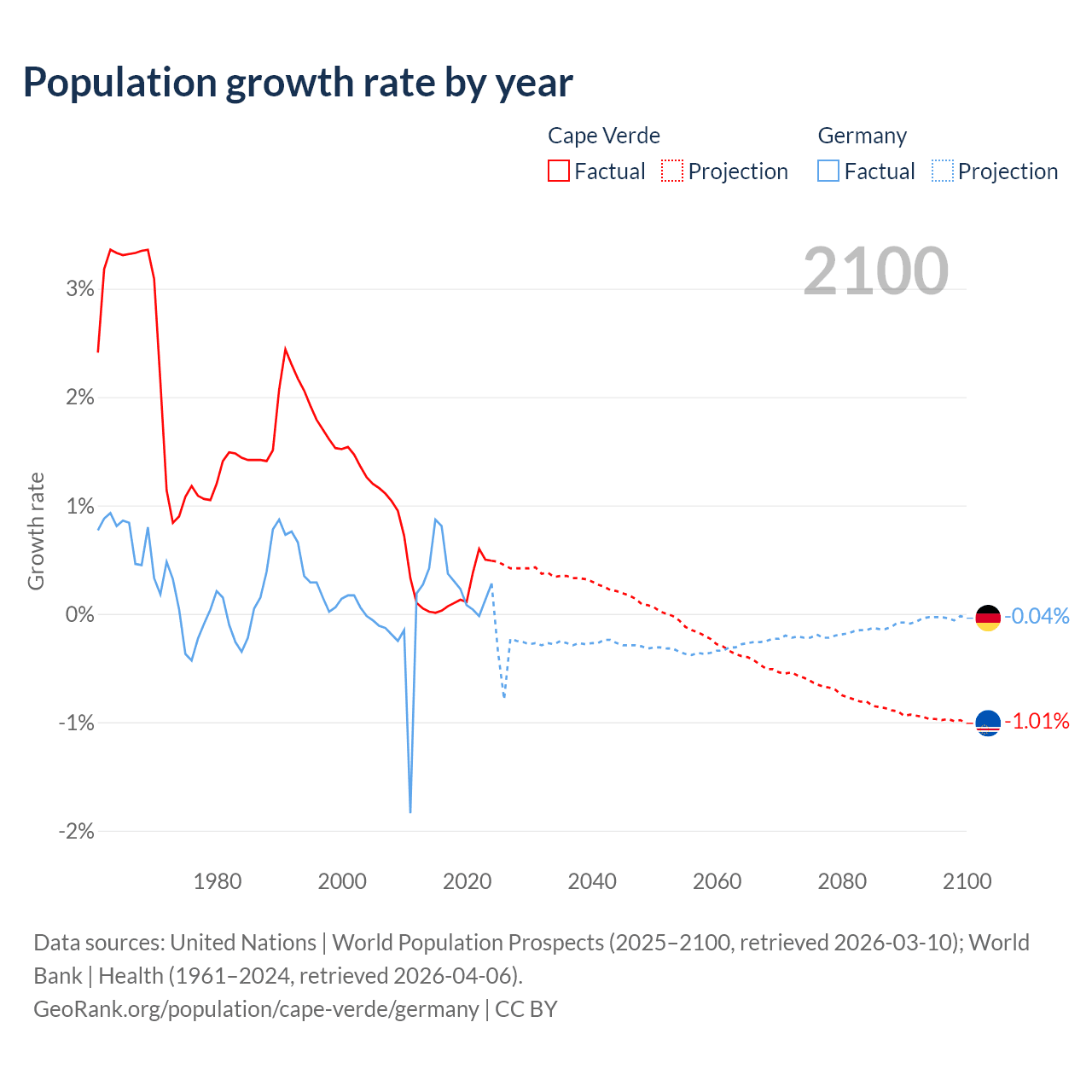 - For the last 10 years, Cape Verde has had an average growth rate of +0.22% per year vs +0.32% in Germany.