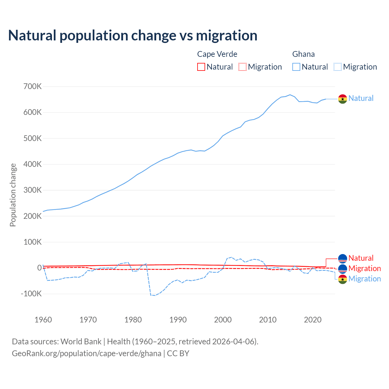 Over the last 10 years, 56.4% of the population change in Cape Verde is from natural causes (a gain of 50,193 people) and 43.6% is from migration (a loss of 38,879 people). In Ghana 98.6% is from natural causes (a gain of 6,484,449 people) and 1.37% is from migration (a loss of 90,310 people).
