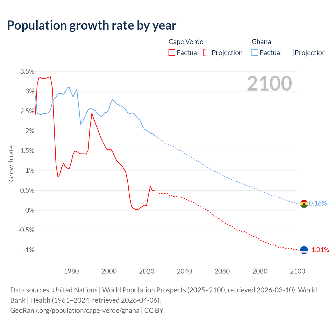 - For the last 10 years, Cape Verde has had an average growth rate of +0.22% per year vs +2.1% in Ghana.