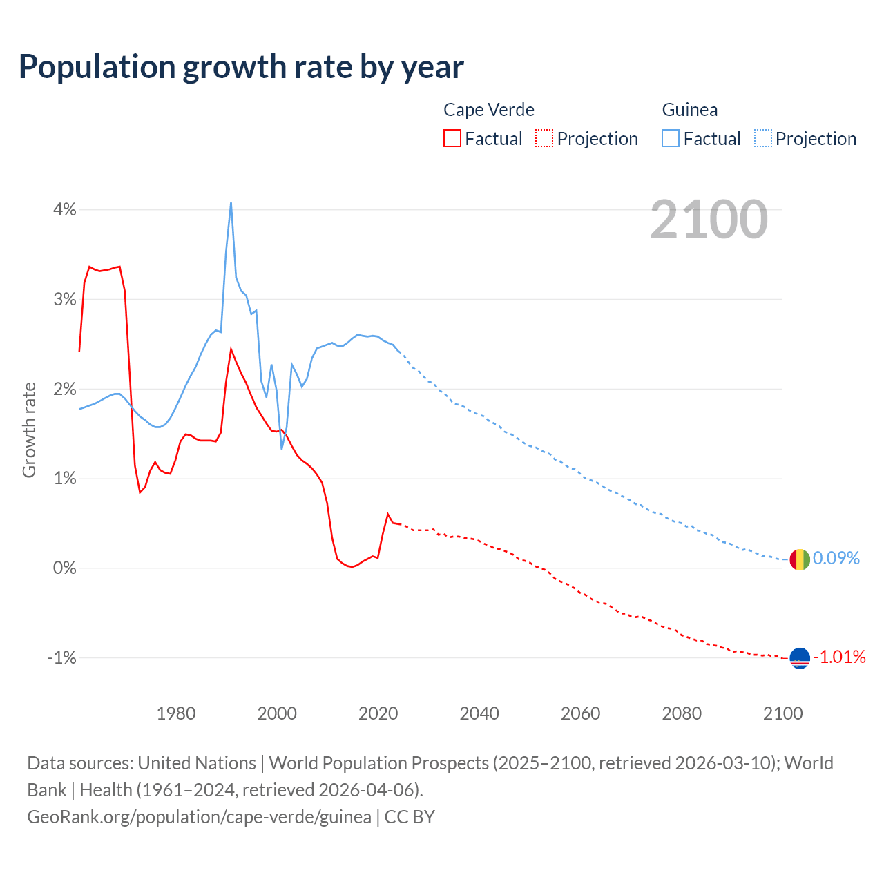 - For the last 10 years, Cape Verde has had an average growth rate of +0.22% per year vs +2.54% in Guinea.