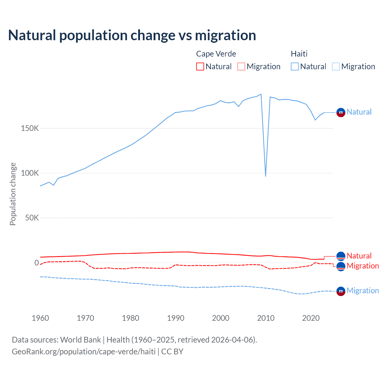 Over the last 10 years, 56.4% of the population change in Cape Verde is from natural causes (a gain of 50,193 people) and 43.6% is from migration (a loss of 38,879 people). In Haiti 83.9% is from natural causes (a gain of 1,740,319 people) and 16.1% is from migration (a loss of 333,076 people).