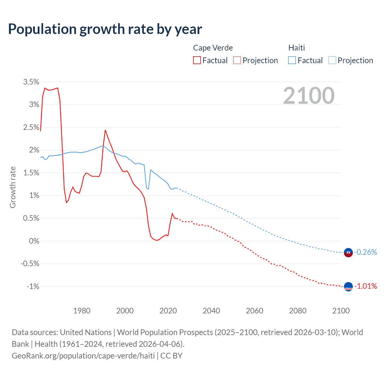 - For the last 10 years, Cape Verde has had an average growth rate of +0.22% per year vs +1.29% in Haiti.