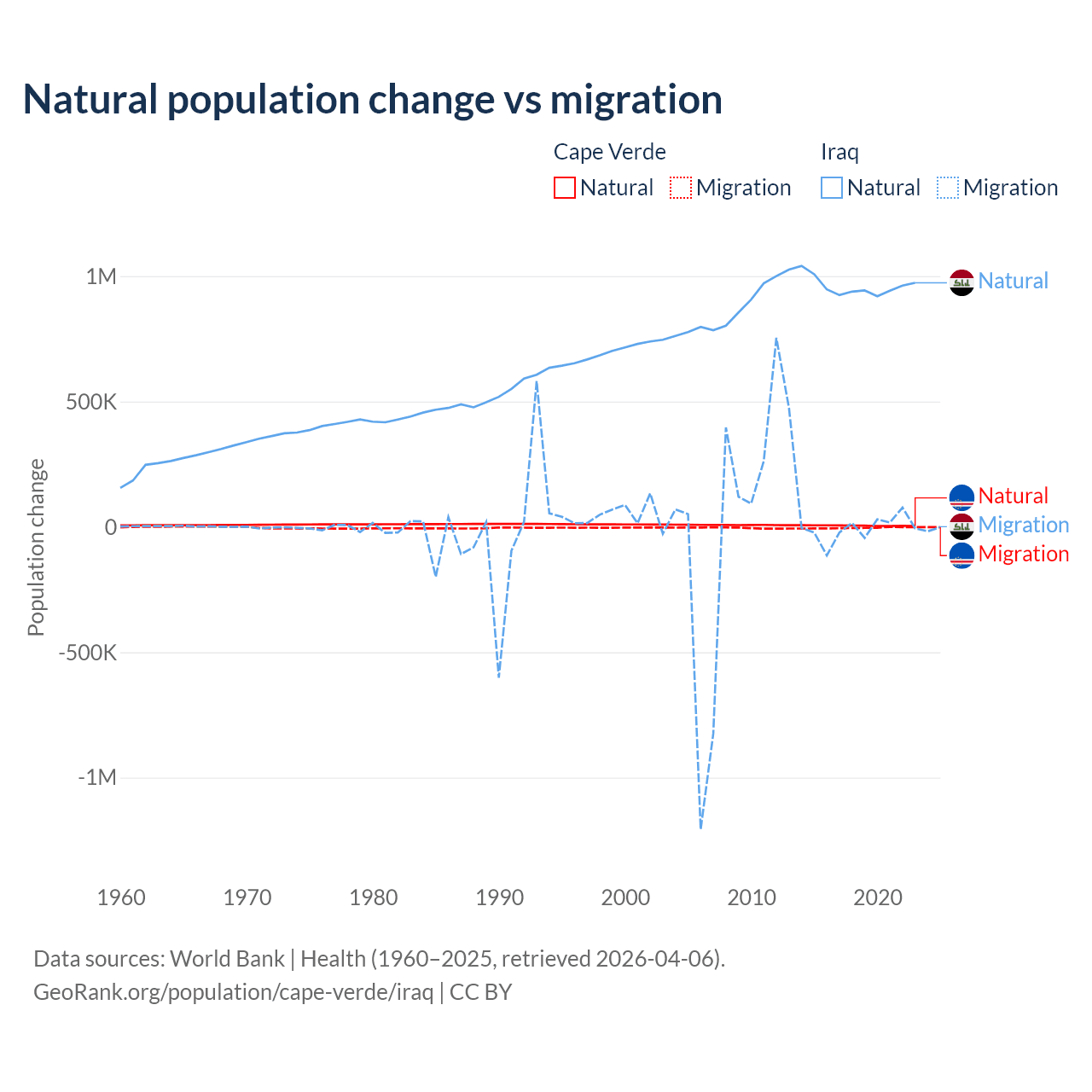 Over the last 10 years, 56.4% of the population change in Cape Verde is from natural causes (a gain of 50,193 people) and 43.6% is from migration (a loss of 38,879 people). In Iraq 99.2% is from natural causes (a gain of 9,598,842 people) and 0.76% is from migration (a loss of 73,050 people).