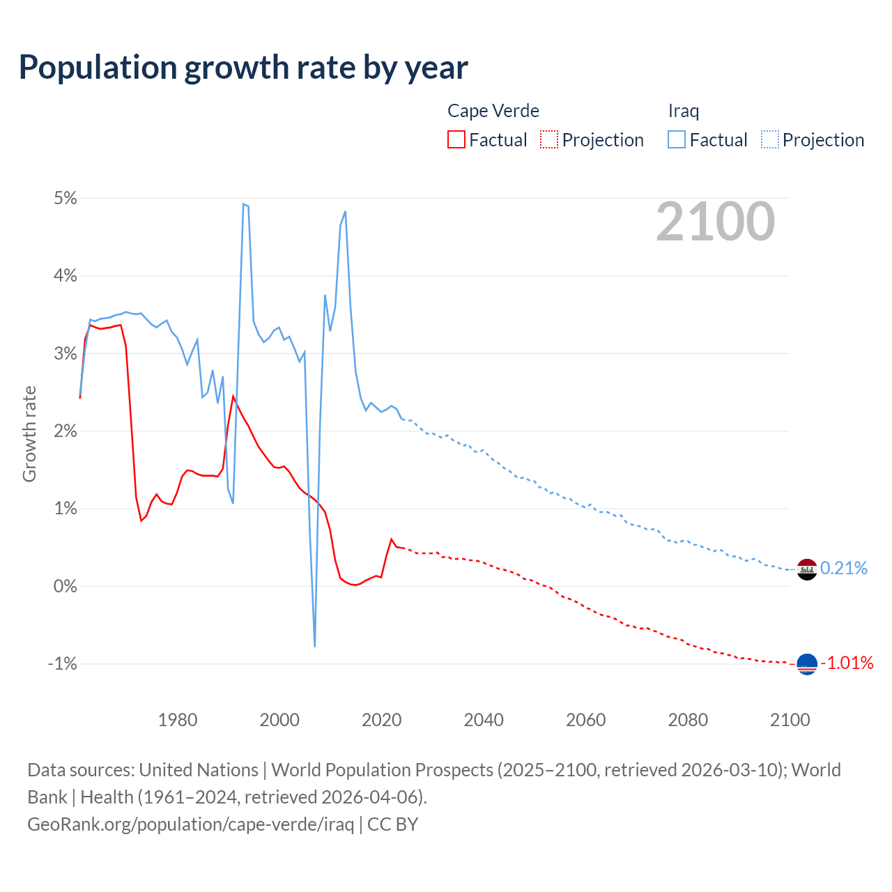 - For the last 10 years, Cape Verde has had an average growth rate of +0.22% per year vs +2.45% in Iraq.