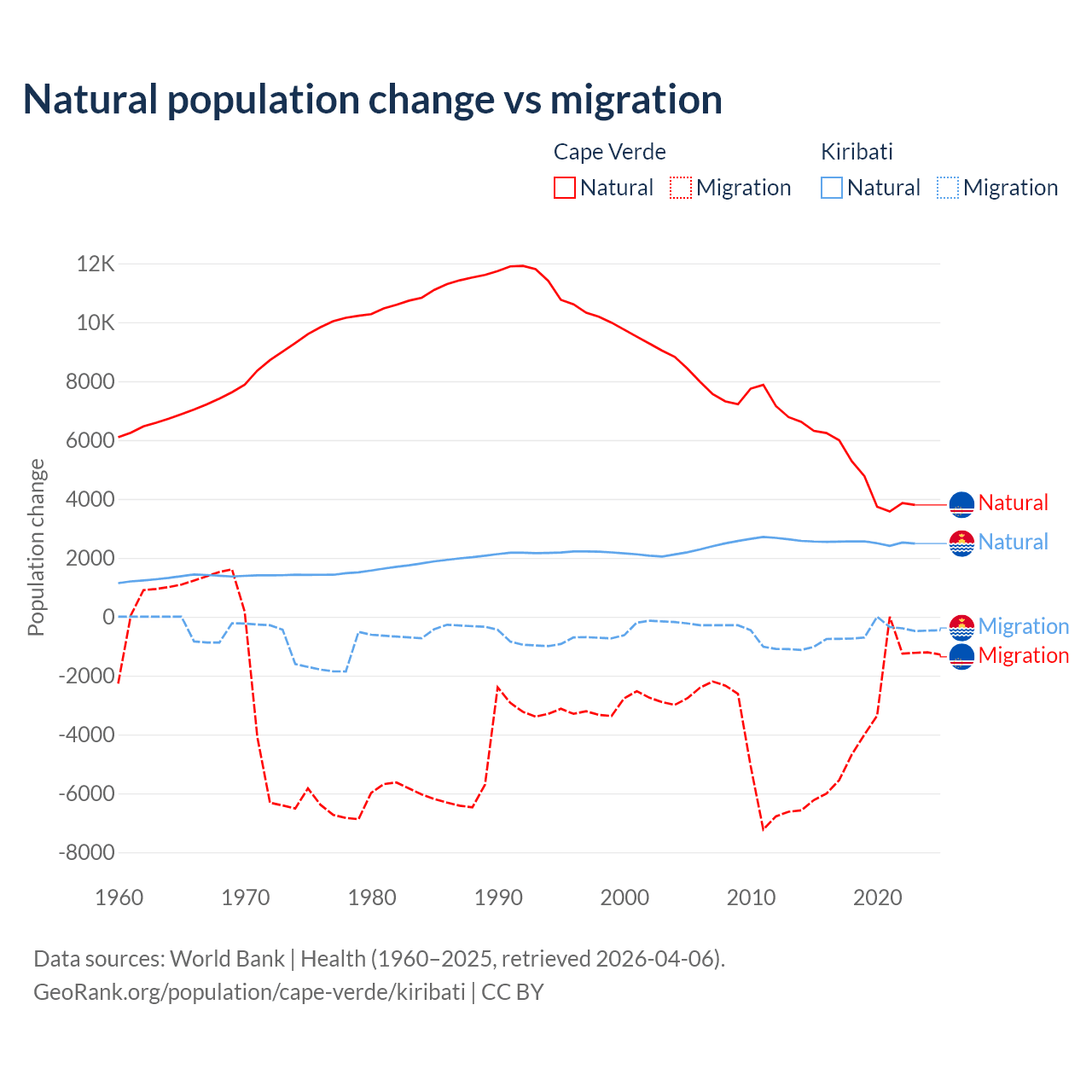 Over the last 10 years, 56.4% of the population change in Cape Verde is from natural causes (a gain of 50,193 people) and 43.6% is from migration (a loss of 38,879 people). In Kiribati 80% is from natural causes (a gain of 25,262 people) and 20% is from migration (a loss of 6,330 people).