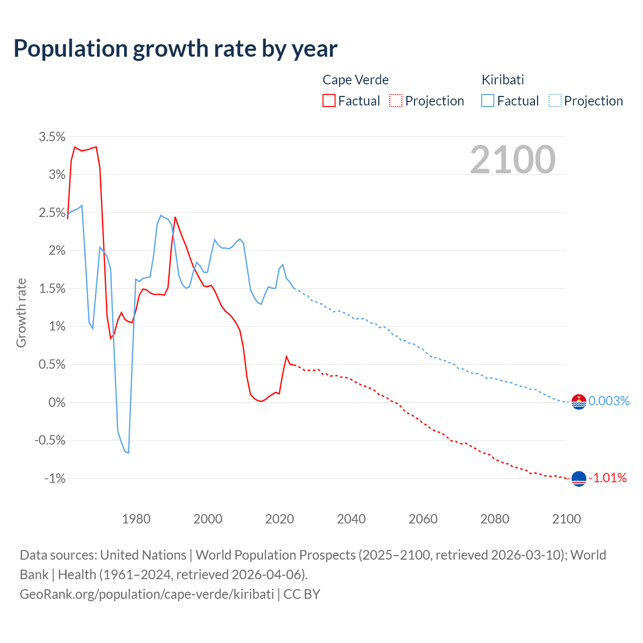 - For the last 10 years, Cape Verde has had an average growth rate of +0.22% per year vs +1.53% in Kiribati.