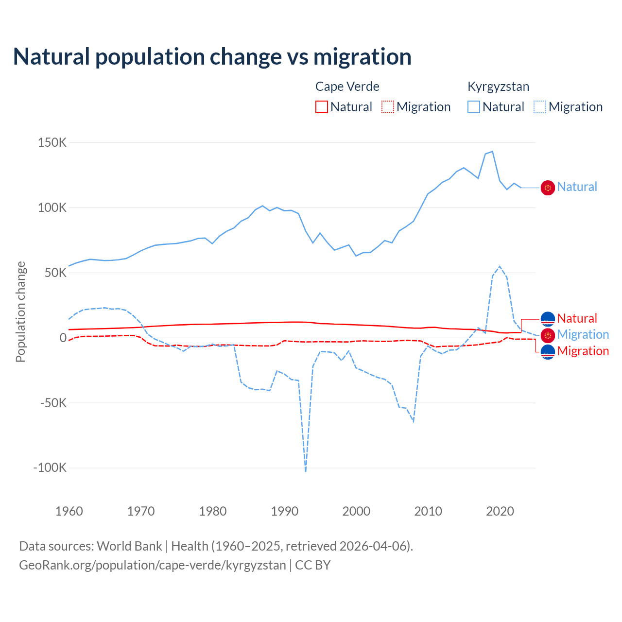 Over the last 10 years, 56.4% of the population change in Cape Verde is from natural causes (a gain of 50,193 people) and 43.6% is from migration (a loss of 38,879 people). In Kyrgyzstan 88.5% is from natural causes (a gain of 1,258,837 people) and 11.5% is from migration (a gain of 164,132 people).