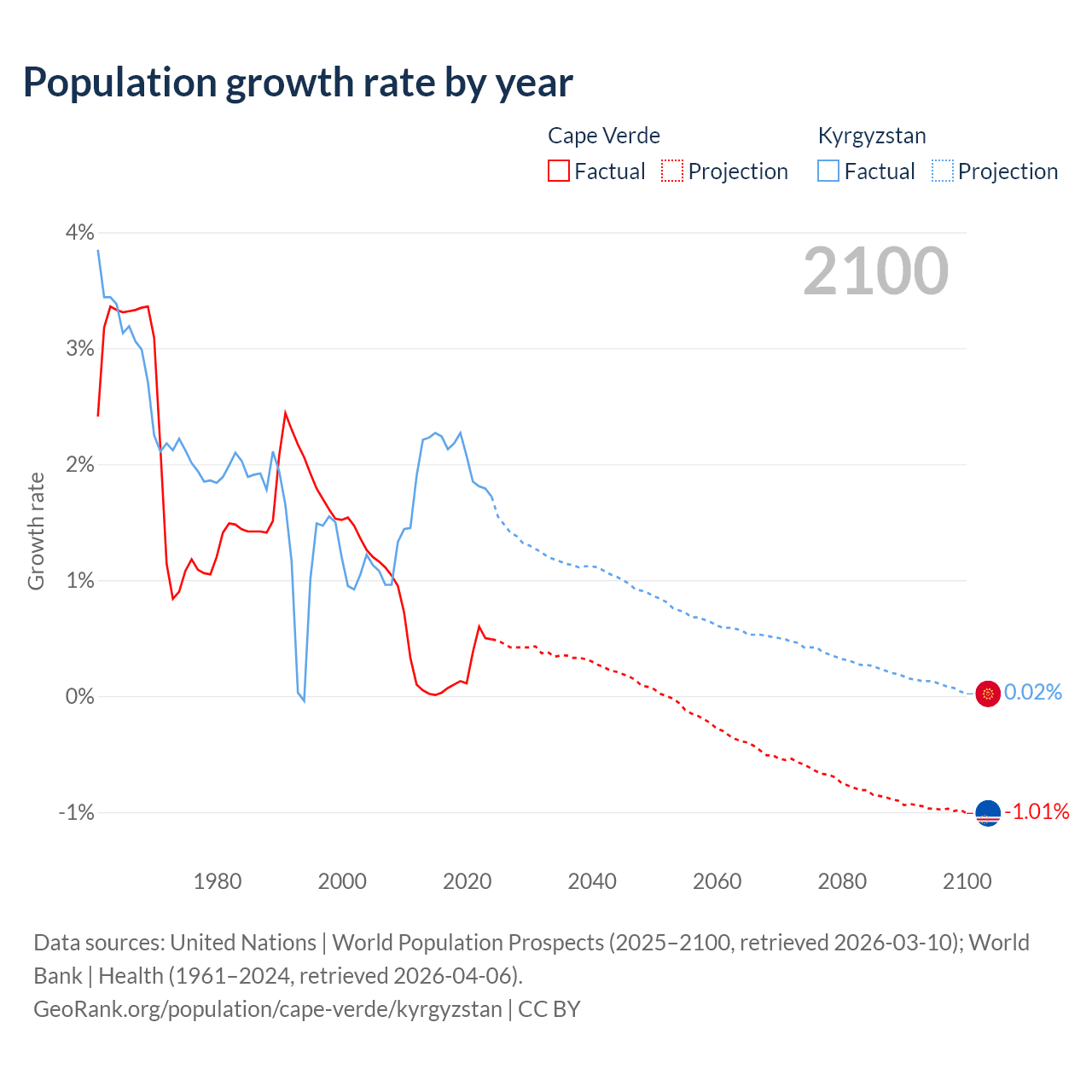 - For the last 10 years, Cape Verde has had an average growth rate of +0.22% per year vs +2.05% in Kyrgyzstan.
