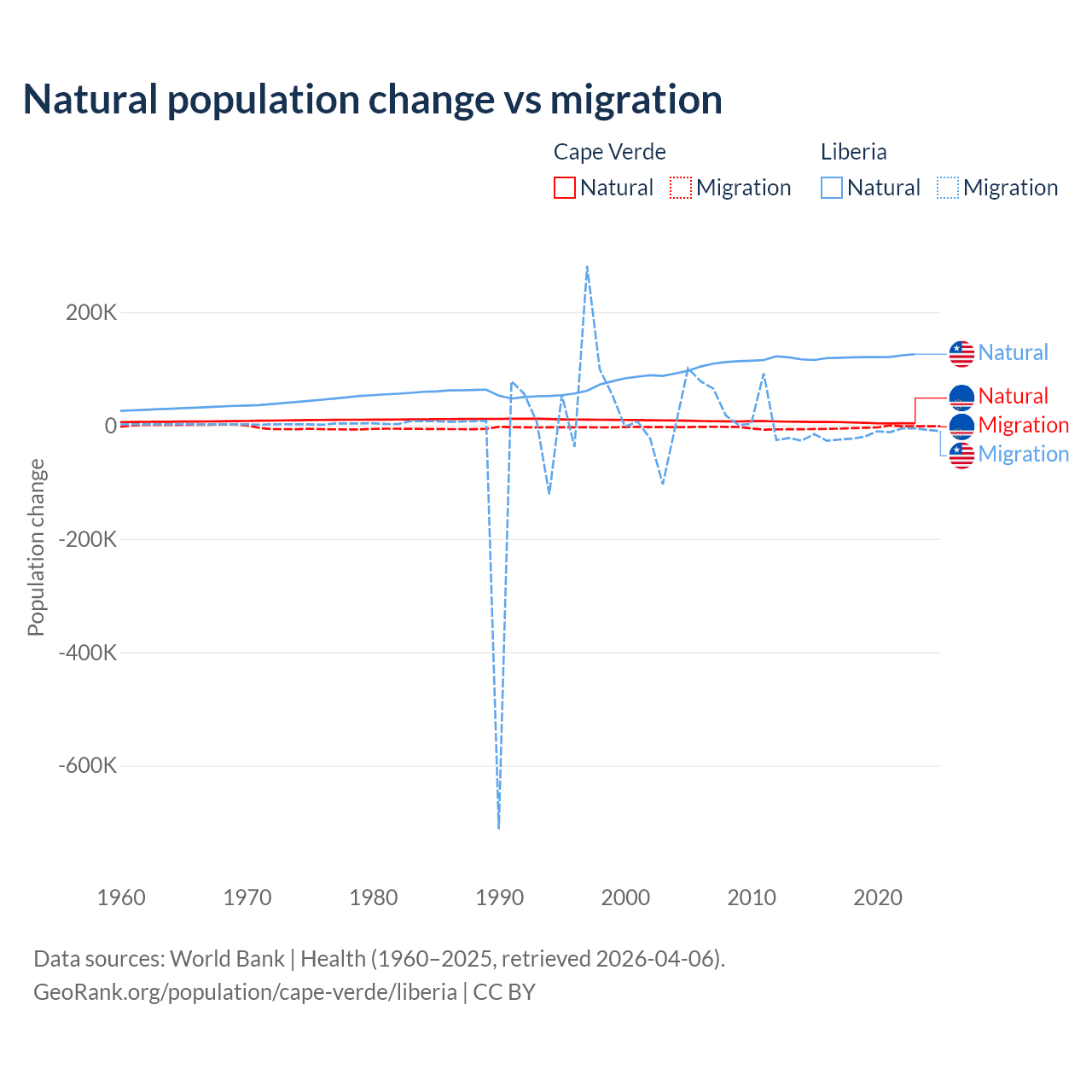 Over the last 10 years, 56.4% of the population change in Cape Verde is from natural causes (a gain of 50,193 people) and 43.6% is from migration (a loss of 38,879 people). In Liberia 87.7% is from natural causes (a gain of 1,202,387 people) and 12.3% is from migration (a loss of 168,316 people).