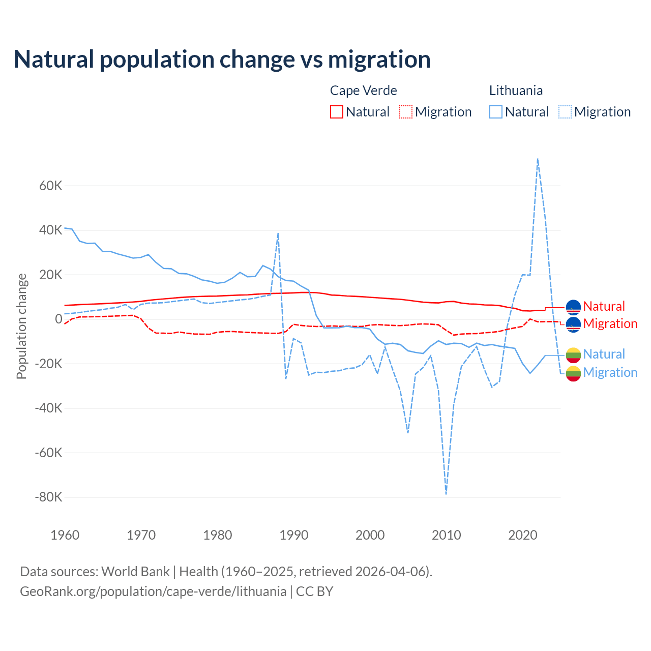 Over the last 10 years, 56.4% of the population change in Cape Verde is from natural causes (a gain of 50,193 people) and 43.6% is from migration (a loss of 38,879 people). In Lithuania 68.7% is from natural causes (a loss of 153,859 people) and 31.3% is from migration (a gain of 70,196 people).