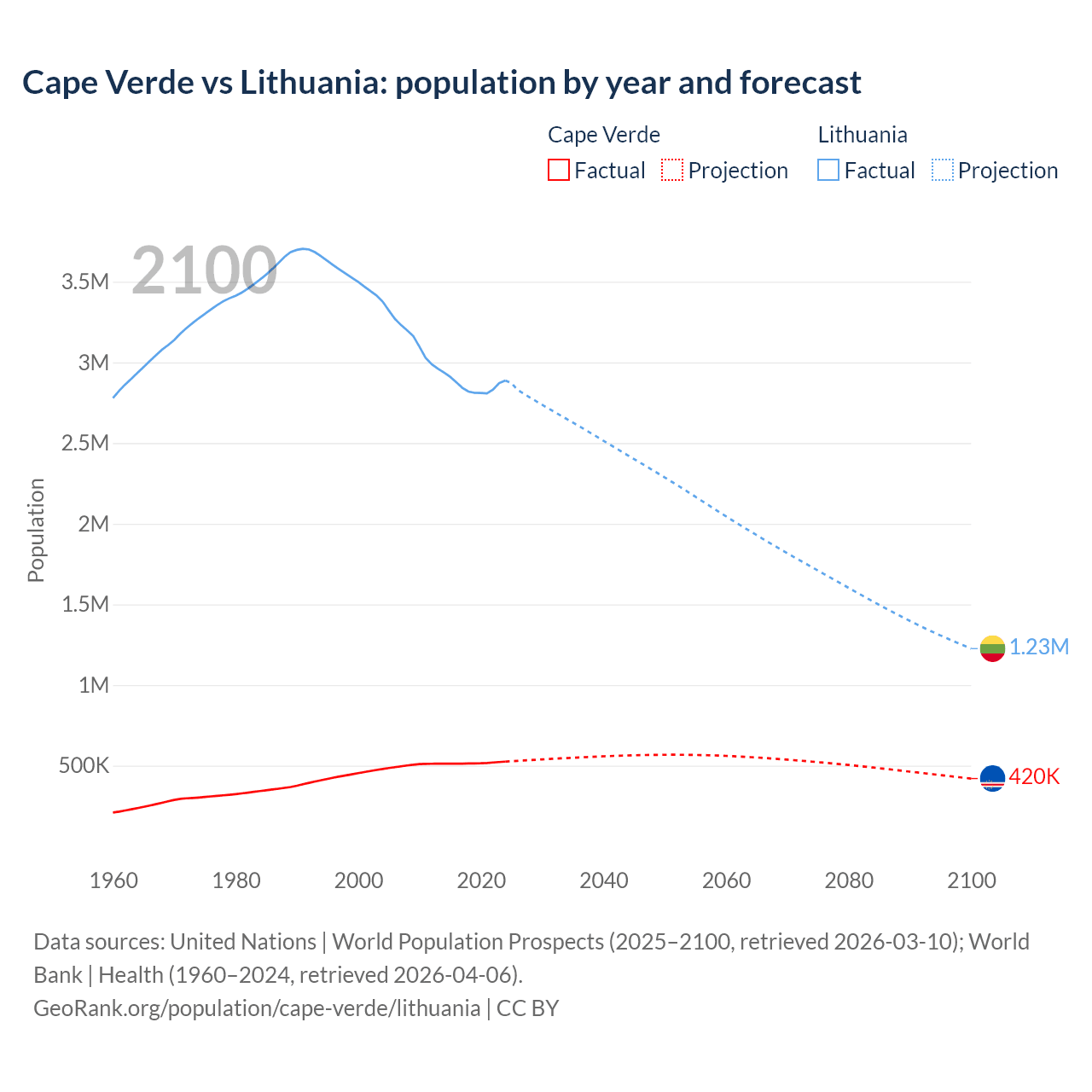 - Since 2006, the population of Cape Verde has increased from 491K people to 530K (8.08% growth), while Lithuania has declined from 3.27M to 2.83M (13.5% decline).