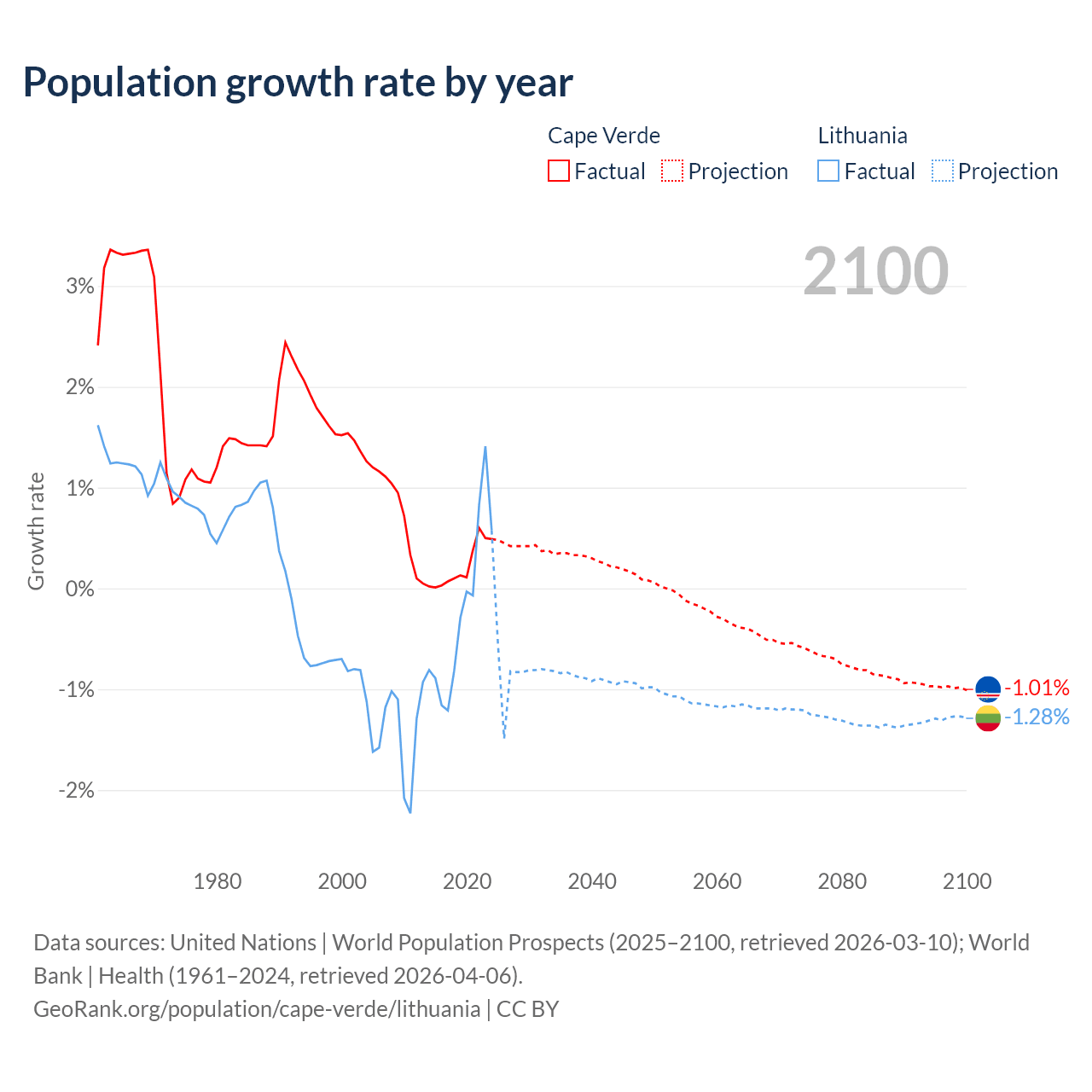 - For the last 10 years, Cape Verde has had an average growth rate of +0.22% per year vs -0.22% in Lithuania.