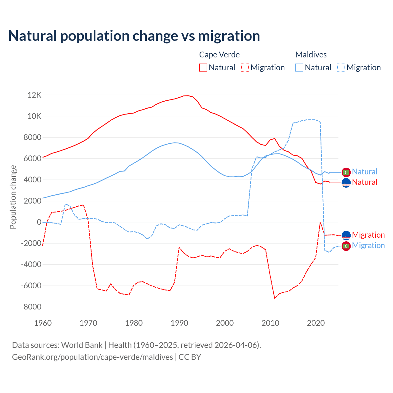 Over the last 10 years, 56.4% of the population change in Cape Verde is from natural causes (a gain of 50,193 people) and 43.6% is from migration (a loss of 38,879 people). In Maldives 42.7% is from natural causes (a gain of 51,342 people) and 57.3% is from migration (a gain of 68,788 people).