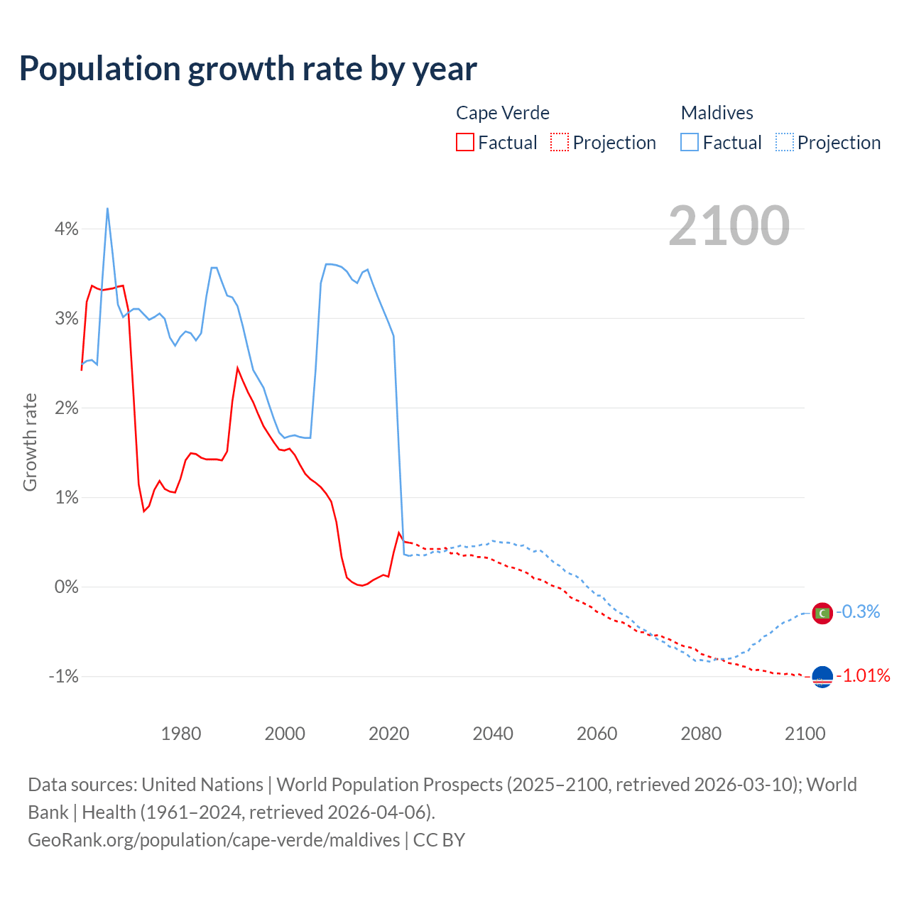 - For the last 10 years, Cape Verde has had an average growth rate of +0.22% per year vs +2.56% in Maldives.