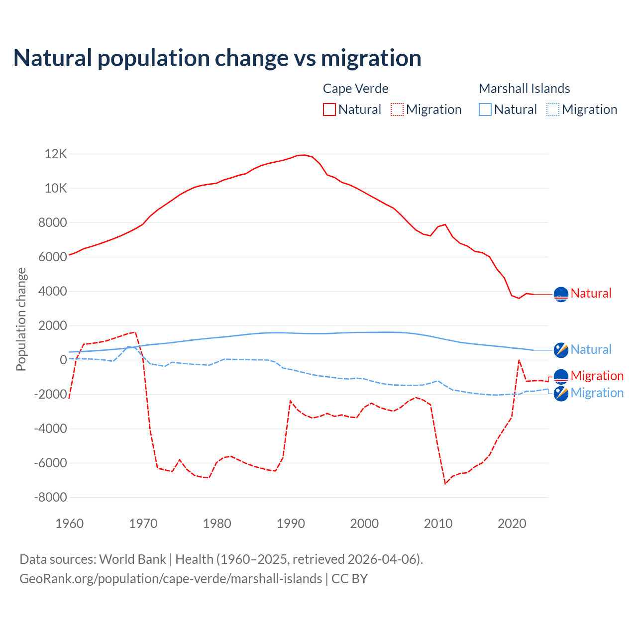 Over the last 10 years, 56.4% of the population change in Cape Verde is from natural causes (a gain of 50,193 people) and 43.6% is from migration (a loss of 38,879 people). In the Marshall Islands 27.8% is from natural causes (a gain of 7,592 people) and 72.2% is from migration (a loss of 19,682 people).