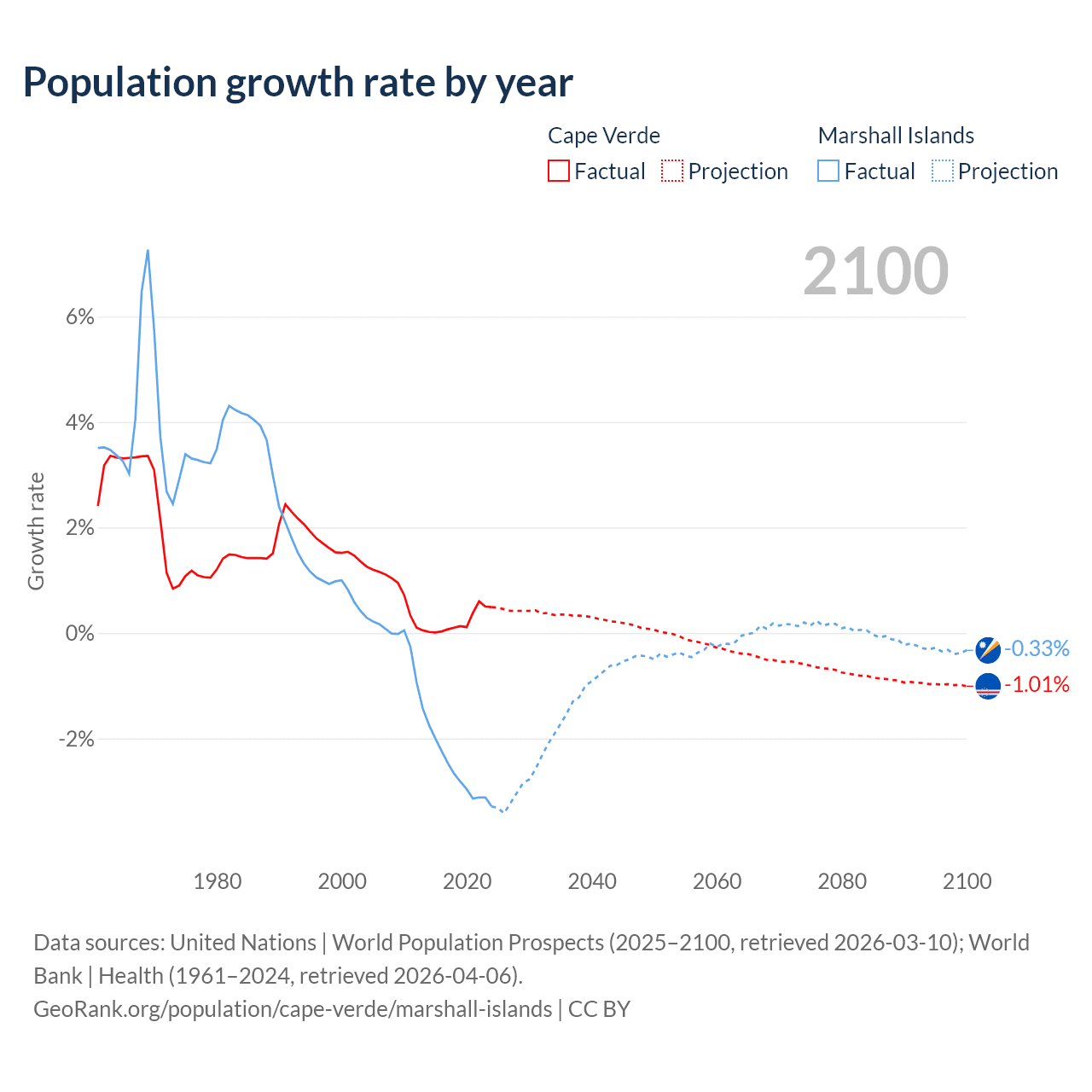 - For the last 10 years, Cape Verde has had an average growth rate of +0.22% per year vs -2.69% in the Marshall Islands.