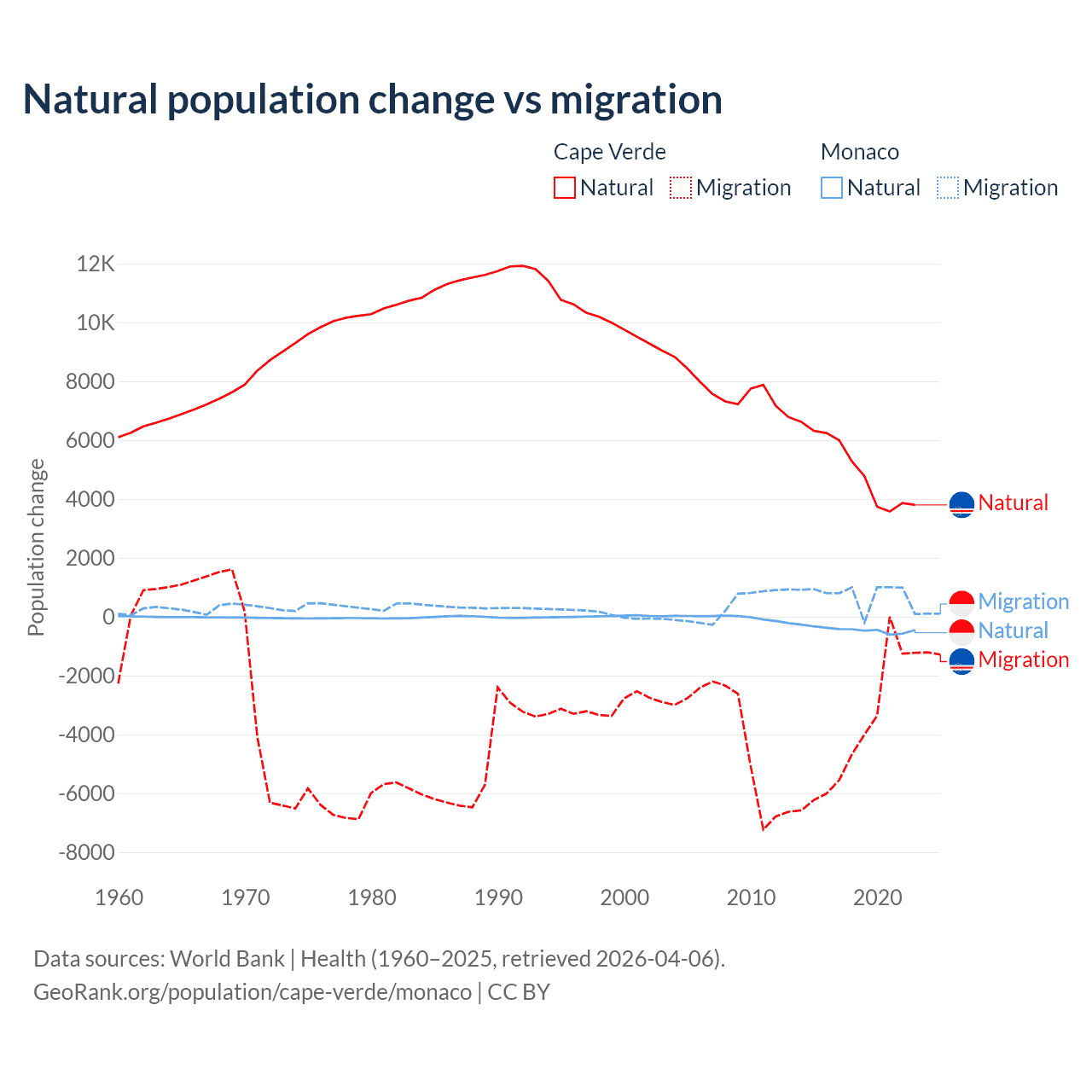 Over the last 10 years, 56.4% of the population change in Cape Verde is from natural causes (a gain of 50,193 people) and 43.6% is from migration (a loss of 38,879 people). In Monaco 37.3% is from natural causes (a loss of 4,357 people) and 62.7% is from migration (a gain of 7,333 people).