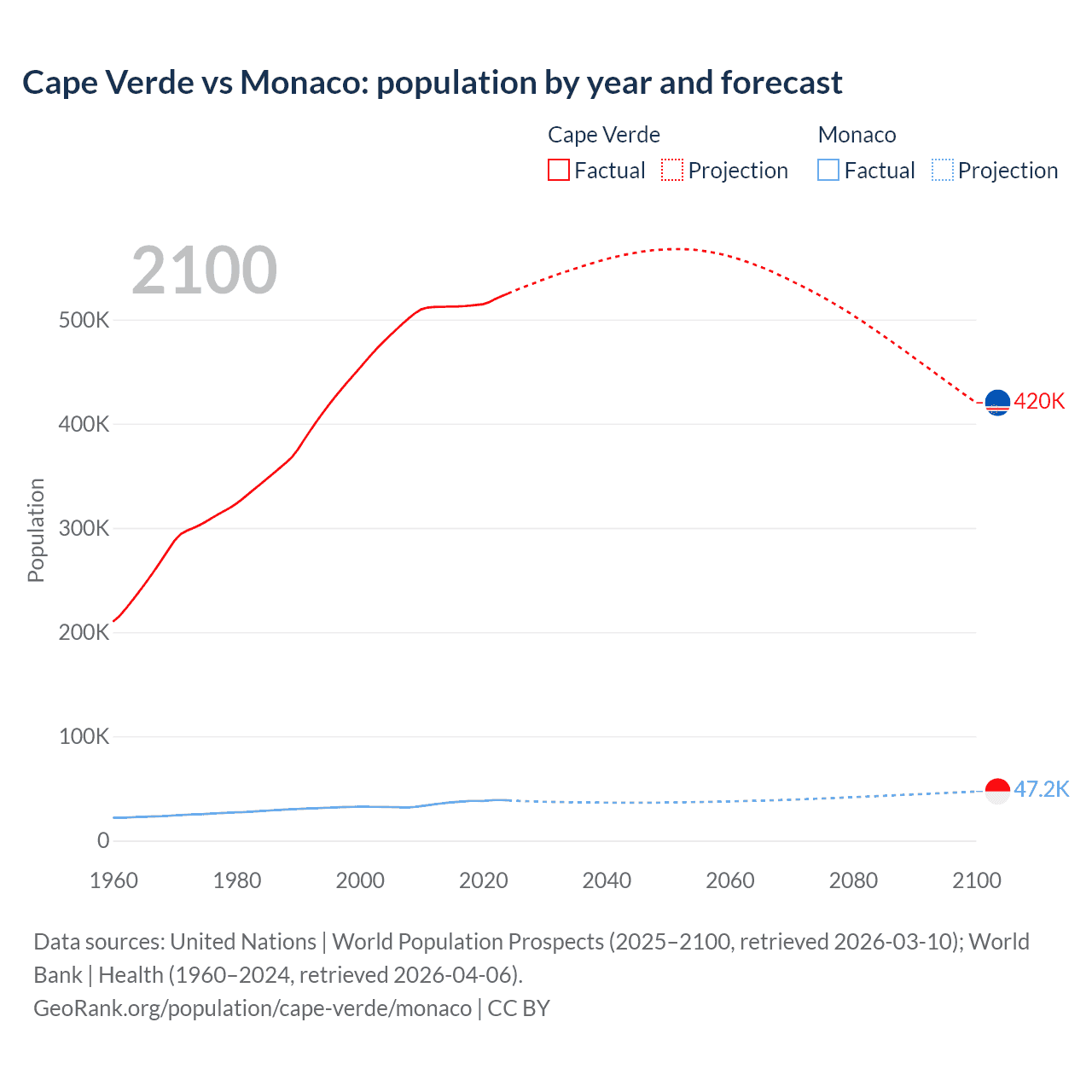 The latest officially reported population of Cape Verde was 524,877 in 2024 vs 38,631 people in Monaco in 2024. In 2026, based on the adjusted UN estimation, the current Cape Verde's population is 530,391 people compared to 38,053 in Monaco.