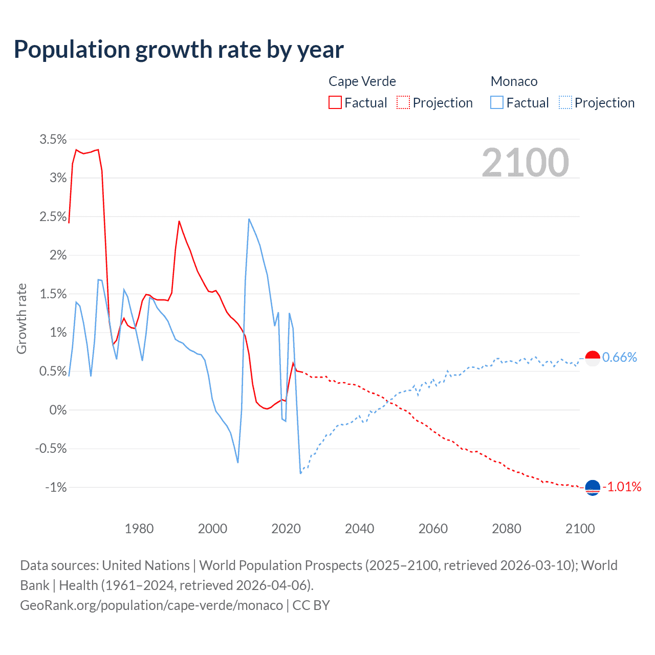 - For the last 10 years, Cape Verde has had an average growth rate of +0.22% per year vs +0.79% in Monaco.