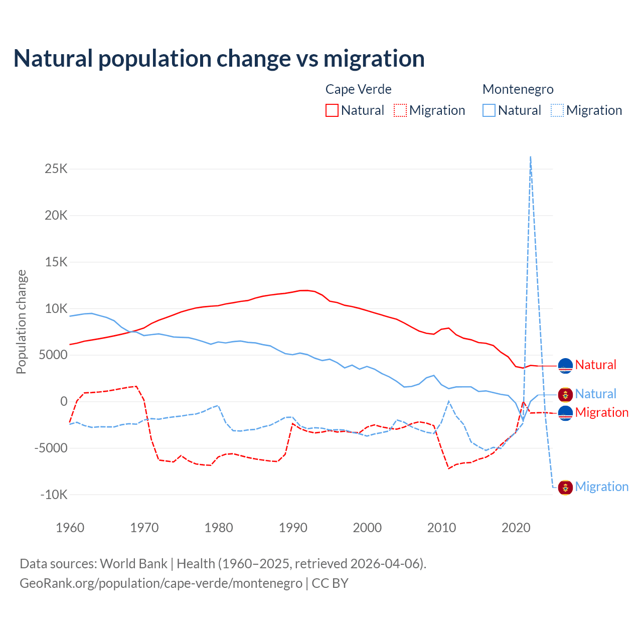 Over the last 10 years, 56.4% of the population change in Cape Verde is from natural causes (a gain of 50,193 people) and 43.6% is from migration (a loss of 38,879 people). In Montenegro 52.4% is from natural causes (a gain of 4,501 people) and 47.6% is from migration (a gain of 4,095 people).
