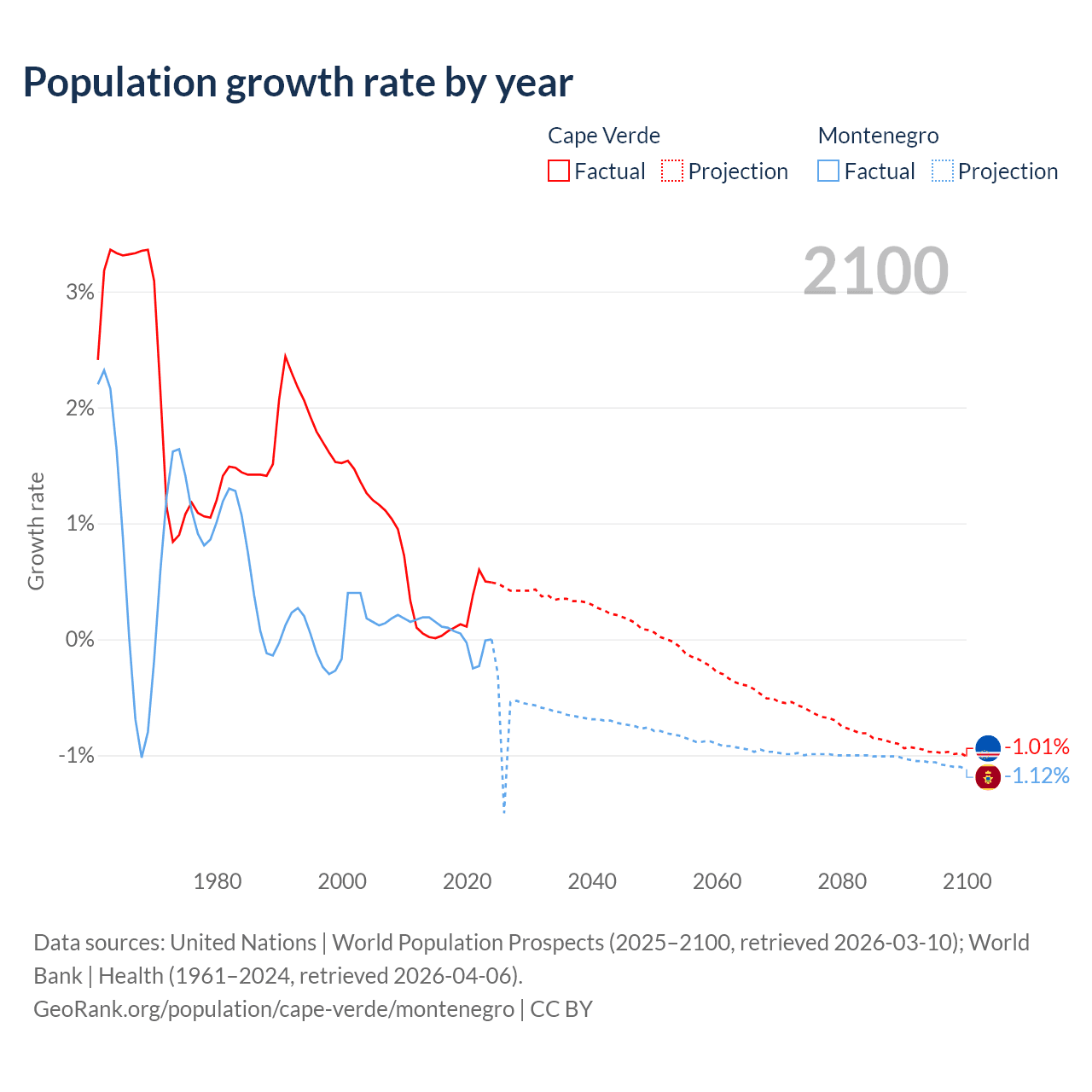 - For the last 10 years, Cape Verde has had an average growth rate of +0.22% per year vs +0.01% in Montenegro.