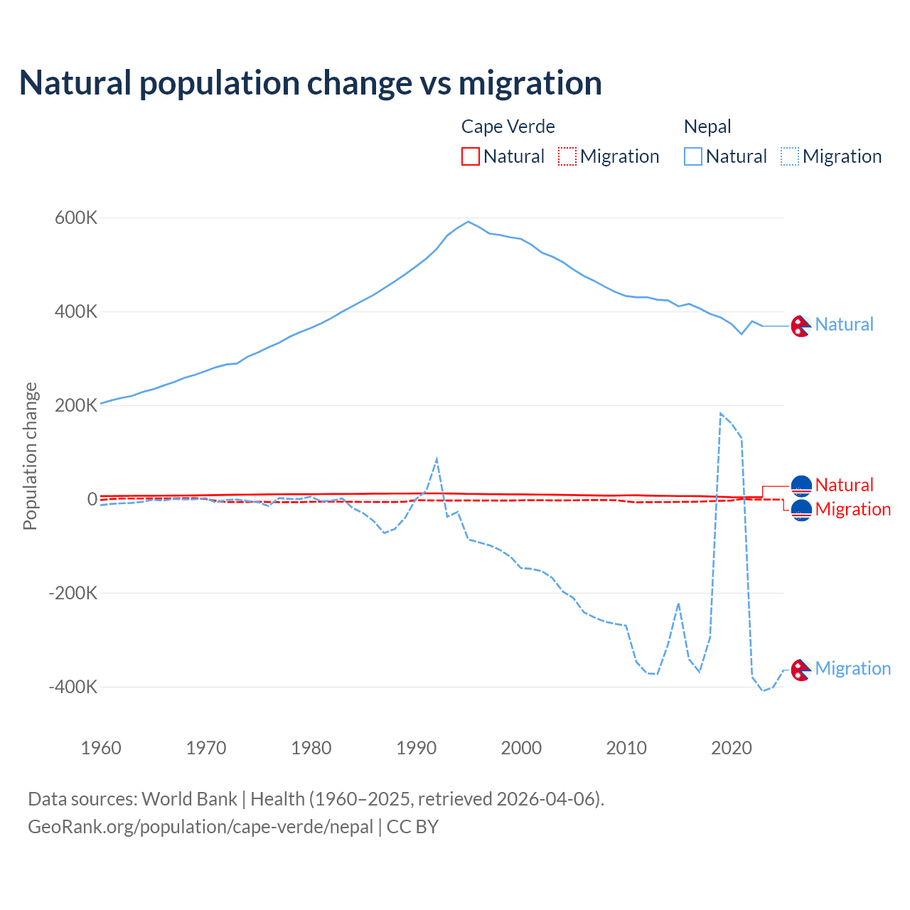 Over the last 10 years, 56.4% of the population change in Cape Verde is from natural causes (a gain of 50,193 people) and 43.6% is from migration (a loss of 38,879 people). In Nepal 67.9% is from natural causes (a gain of 3,909,749 people) and 32.1% is from migration (a loss of 1,851,664 people).