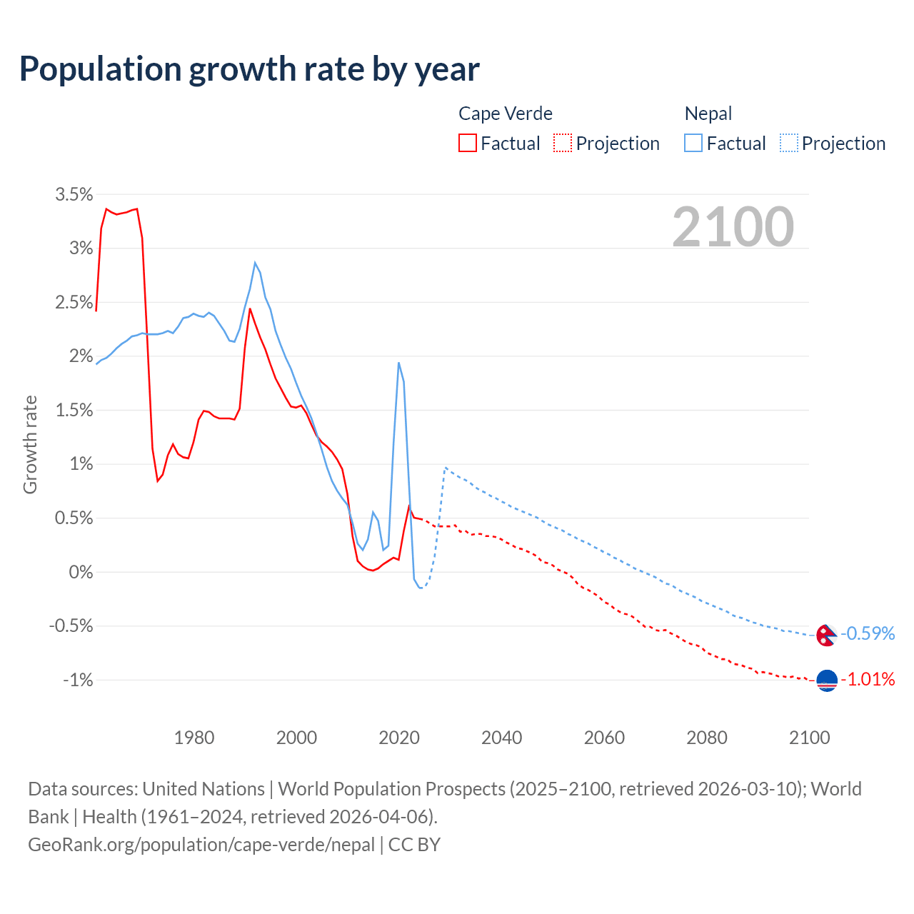 - For the last 10 years, Cape Verde has had an average growth rate of +0.22% per year vs +0.66% in Nepal.