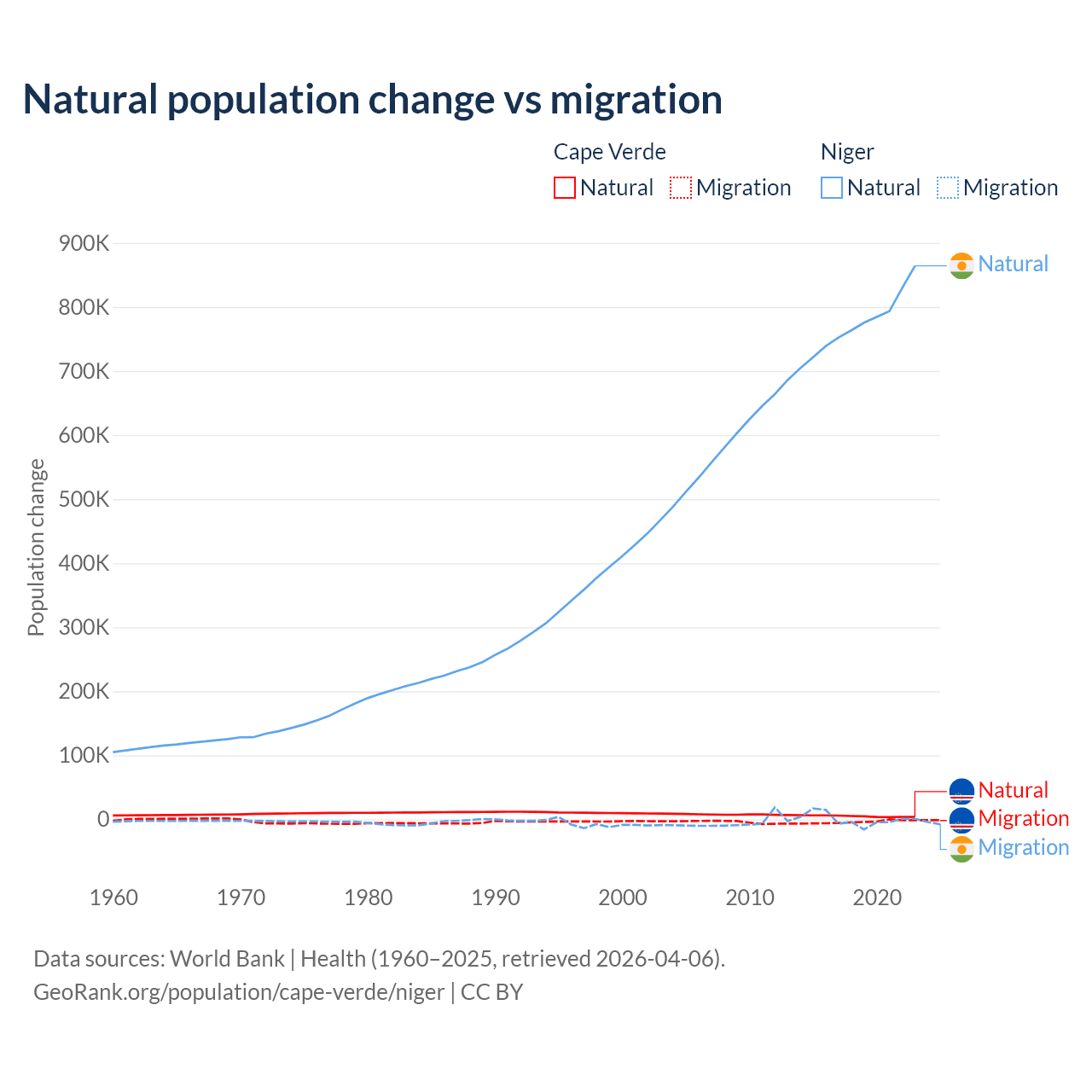 Over the last 10 years, 56.4% of the population change in Cape Verde is from natural causes (a gain of 50,193 people) and 43.6% is from migration (a loss of 38,879 people). In Niger 100% is from natural causes (a gain of 7,728,287 people) and 0.03% is from migration (a gain of 2,520 people).