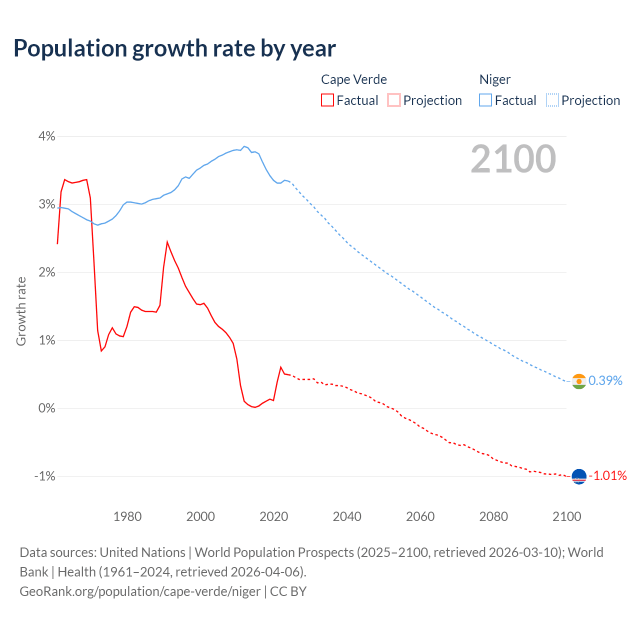 - For the last 10 years, Cape Verde has had an average growth rate of +0.22% per year vs +3.5% in Niger.