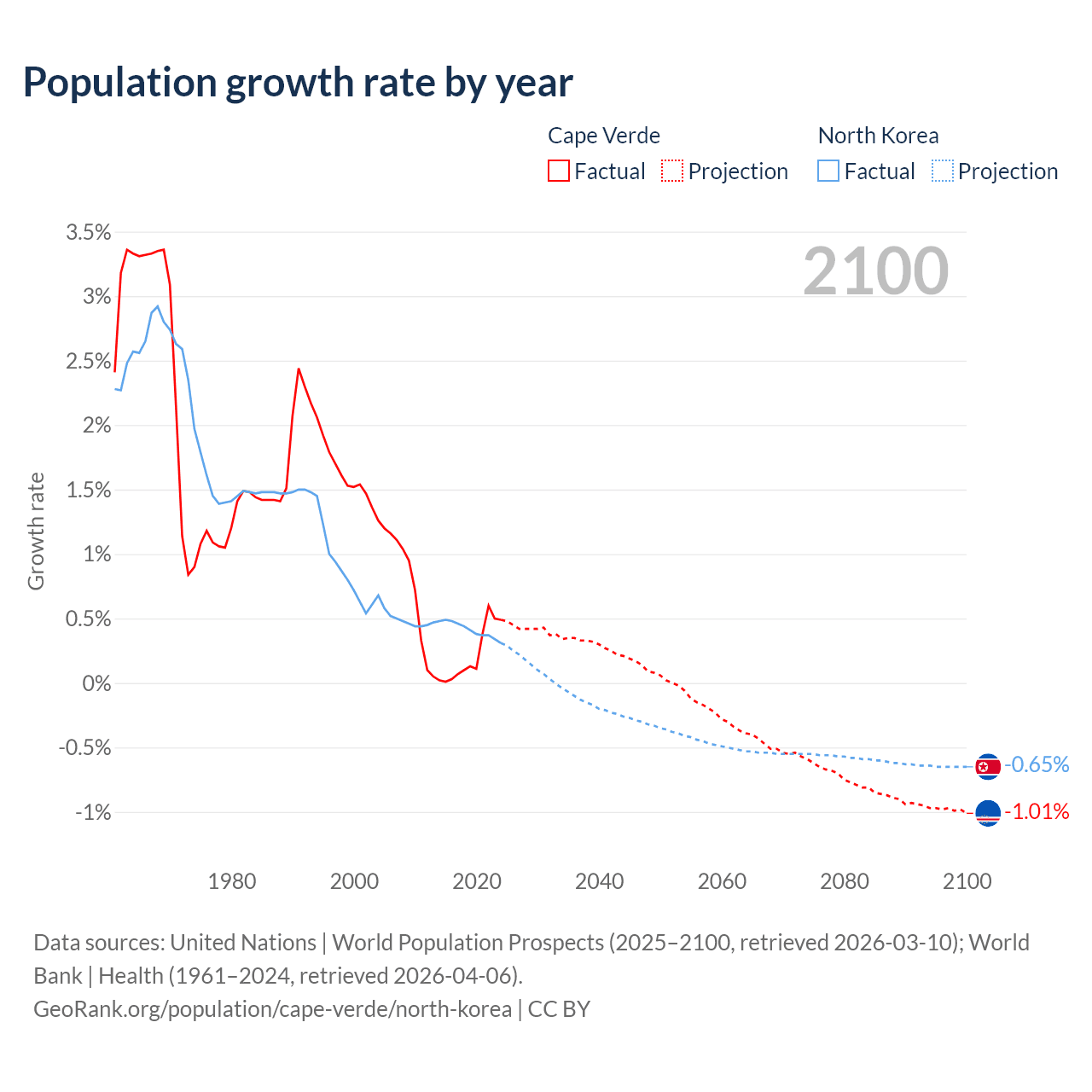 - For the last 10 years, Cape Verde has had an average growth rate of +0.22% per year vs +0.41% in North Korea.