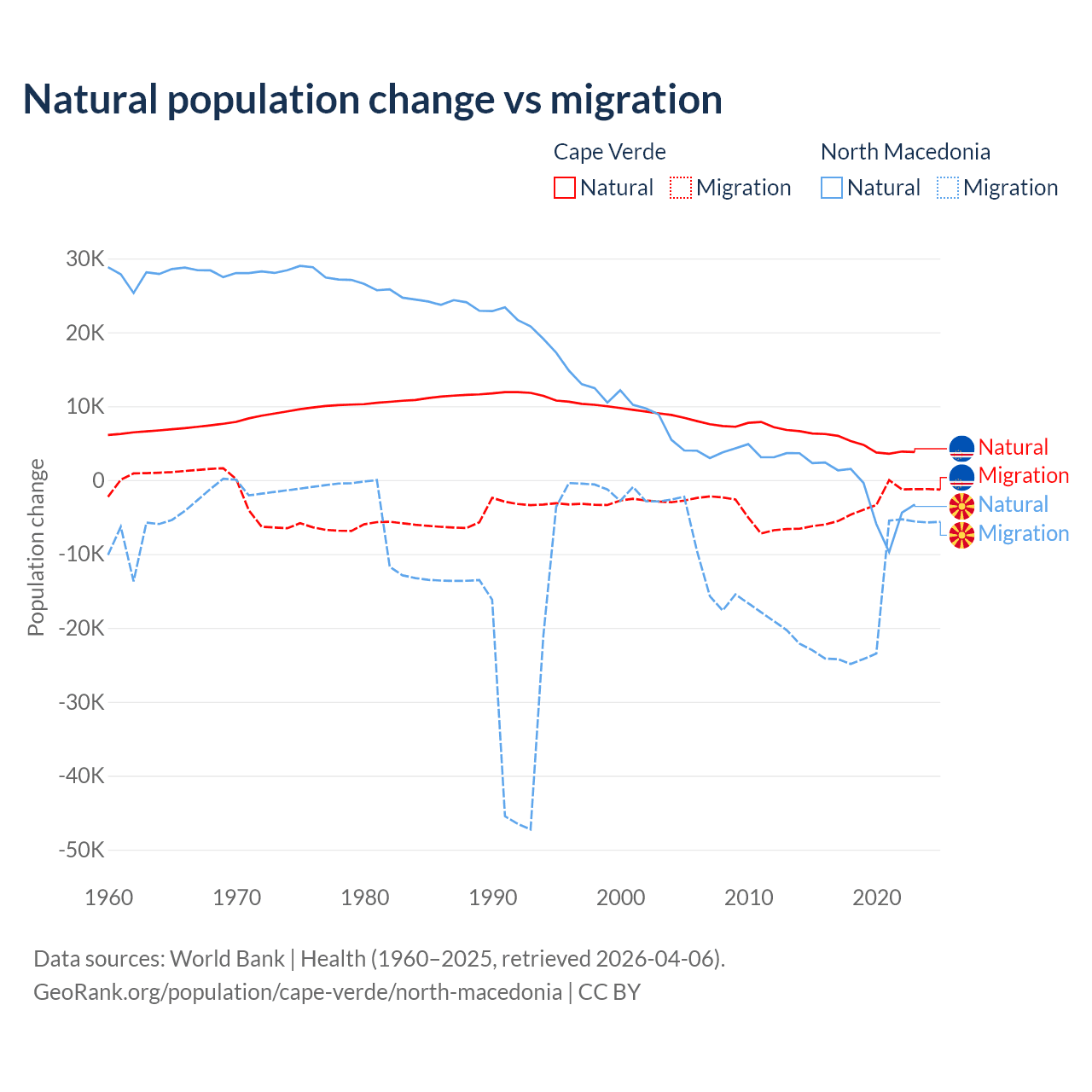 Over the last 10 years, 56.4% of the population change in Cape Verde is from natural causes (a gain of 50,193 people) and 43.6% is from migration (a loss of 38,879 people). In North Macedonia 6.45% is from natural causes (a loss of 12,585 people) and 93.5% is from migration (a loss of 182,429 people).