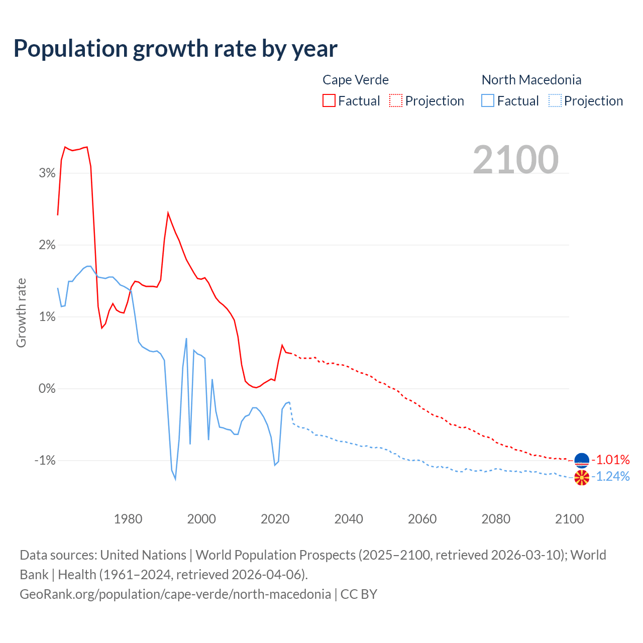 - For the last 10 years, Cape Verde has had an average growth rate of +0.22% per year vs -0.48% in North Macedonia.